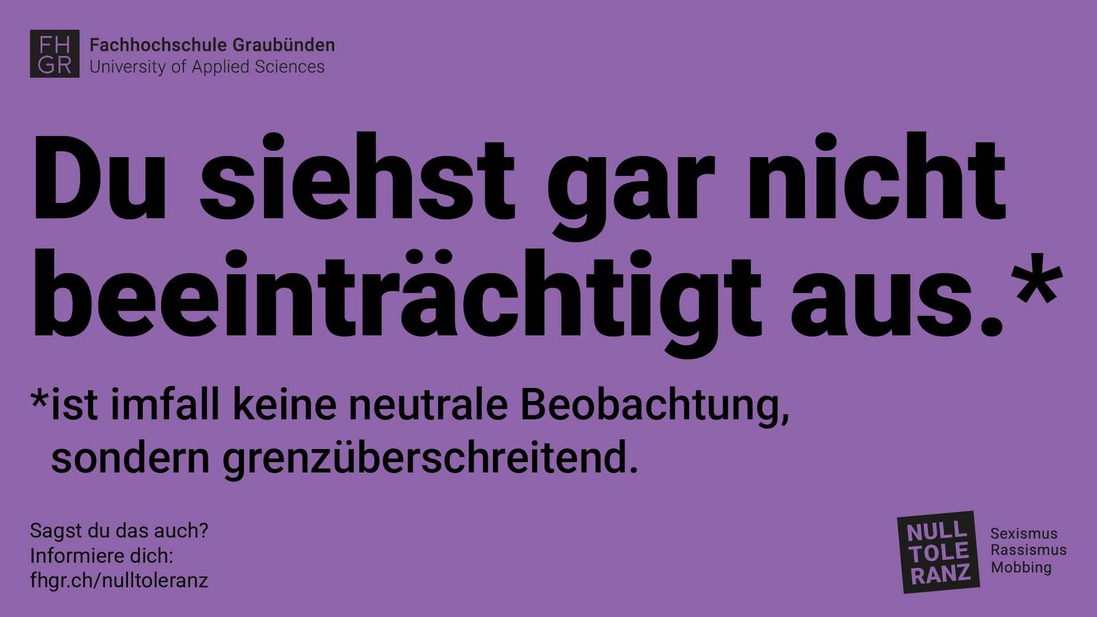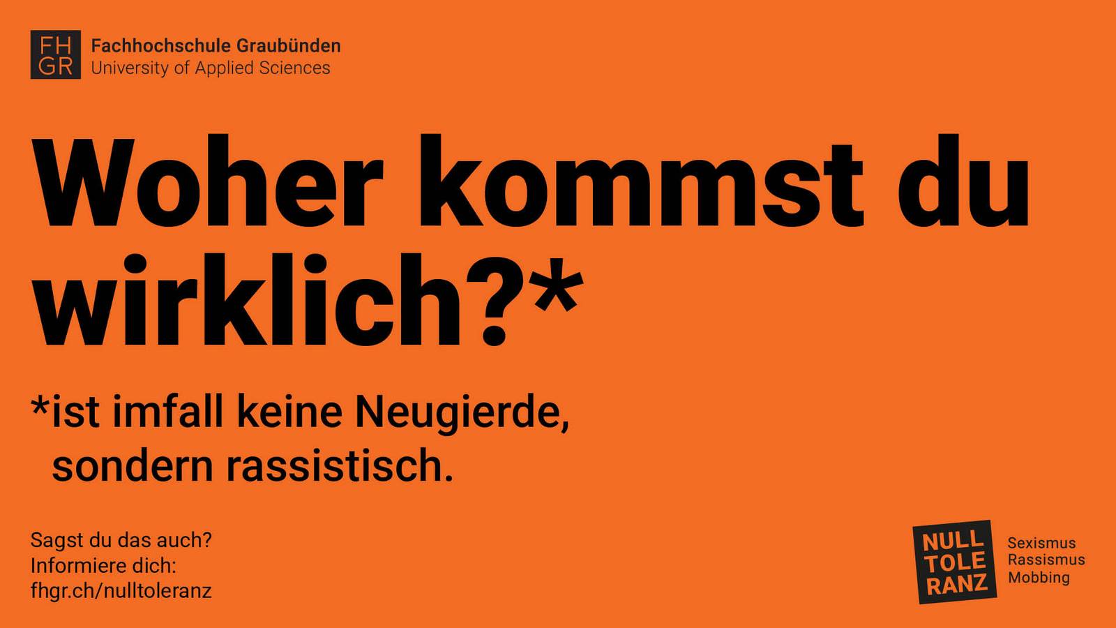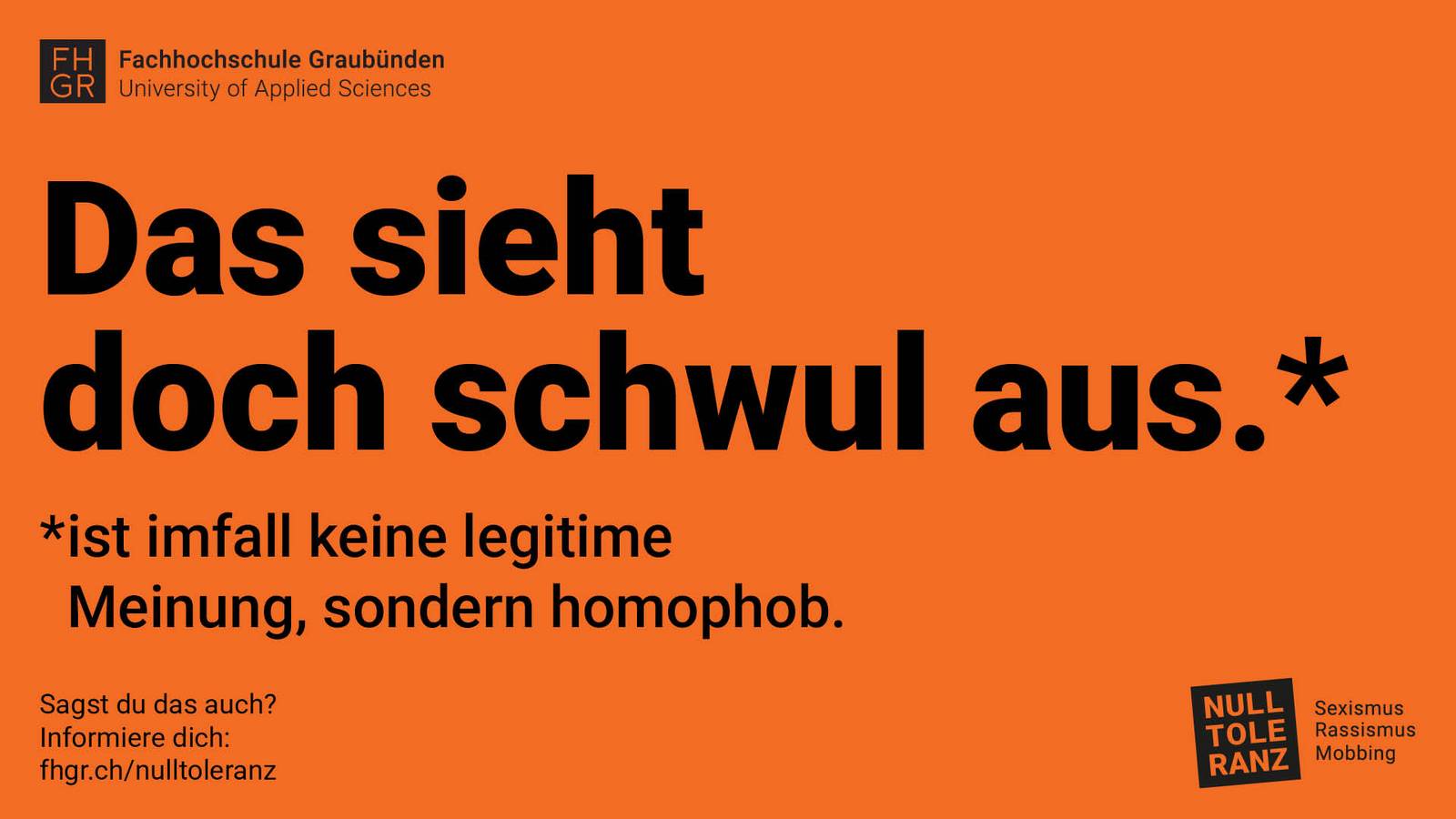 Das Kampagnenlogo lehnt sich bewusst an das FHGR-Logo an – ist aber schräg gestellt. Es bricht mit Gewohntem, spielt mit Form und Perspektive und macht so Diversität sichtbar. Klar, aber gleichzeitig ansprechend – genau wie die Haltung, für die die Kampagne steht.