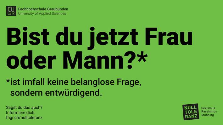 Persönliche Integrität und Respekt betreffen uns alle – im Studium, im Arbeitsalltag und im Miteinander an der FH Graubünden. Ein respektvolles und diverses Miteinander gelingt nur, wenn wir unsere eigene Integrität ernst nehmen und die der anderen achten. Gleichzeitig haben wir gemerkt, dass es viele Fragen gibt, wenn es um Themen wie sexuelle Belästigung, Sexismus, Mobbing und Diskriminierung geht.