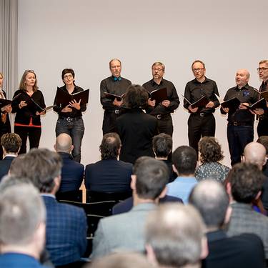 The sessions take place on Wednesdays from 12.10 p.m. to 1.10 p.m. in the hall in location A. The rehearsals are led by a professional choir master, Heinz Girschweiler.