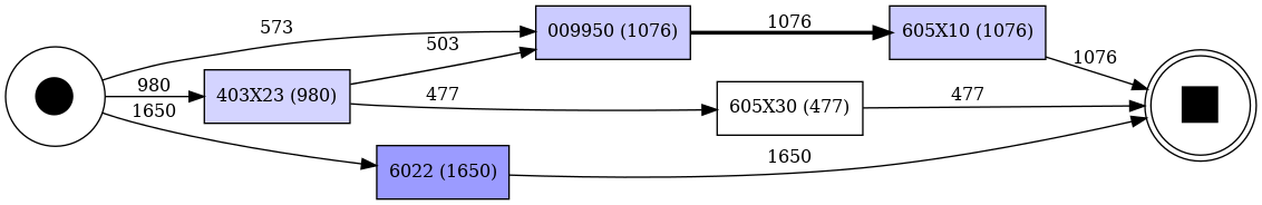 Nachdem die automatische Verknüpfung von Text und medizinischen Codierungen erfolgreich umgesetzt werden konnte, wurden in einem weiteren Schritt die Behandlungspfade mithilfe statistischer und prozessorientierter Methoden, zusammengefasst unter dem Fachbegriff «Process Mining», analysiert und visualisiert. Eine solche Darstellung wurde exemplarisch für Prostatakrebspatienten auf Basis der Gesundheitsversorgungsstatistik 1998–2022 des Bundesamts für Statistik erstellt (siehe Abbildung 1).