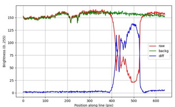 Aufgrund der Leistungs-Einschränkungen kann nur ein Mikrocontroller mit begrenzten Fähigkeiten verwendet werden. Daher wurde ein intelligenter Algorithmus entwickelt, welcher unter anderem die Hintergrundsituation mitberücksichtig. Dazu wird das Hintergrundsignal (Abb. 3 grün) von dem Messsignal (Abb. 3 rot) subtrahiert und das resultierende Differenzsignal (Abb.3 blau) weiter prozessiert.