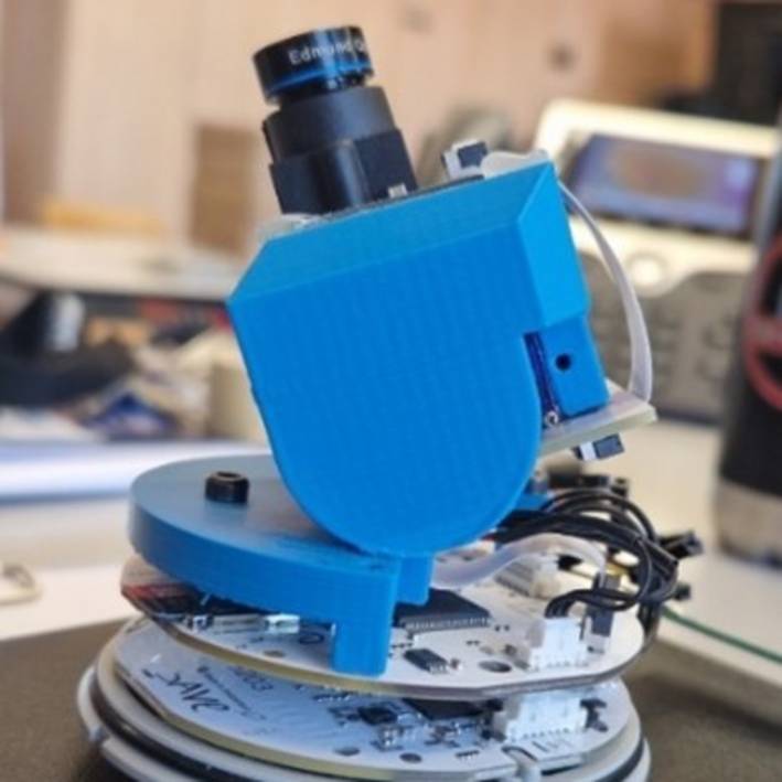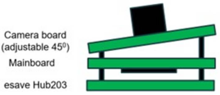 Der Sensor besteht aus einem PCB-Stack (Abb. 1 links) mit einem Kameraboard, dem Mainboard und dem bestehenden Board der Firma esave. Die Kamera kann per Servoansteuerung (Abb. 1 Mitte) verstellt werden und wird an der Zhaga-Schnittstelle an der Strassenlampe montiert (Abb. 1 rechts).