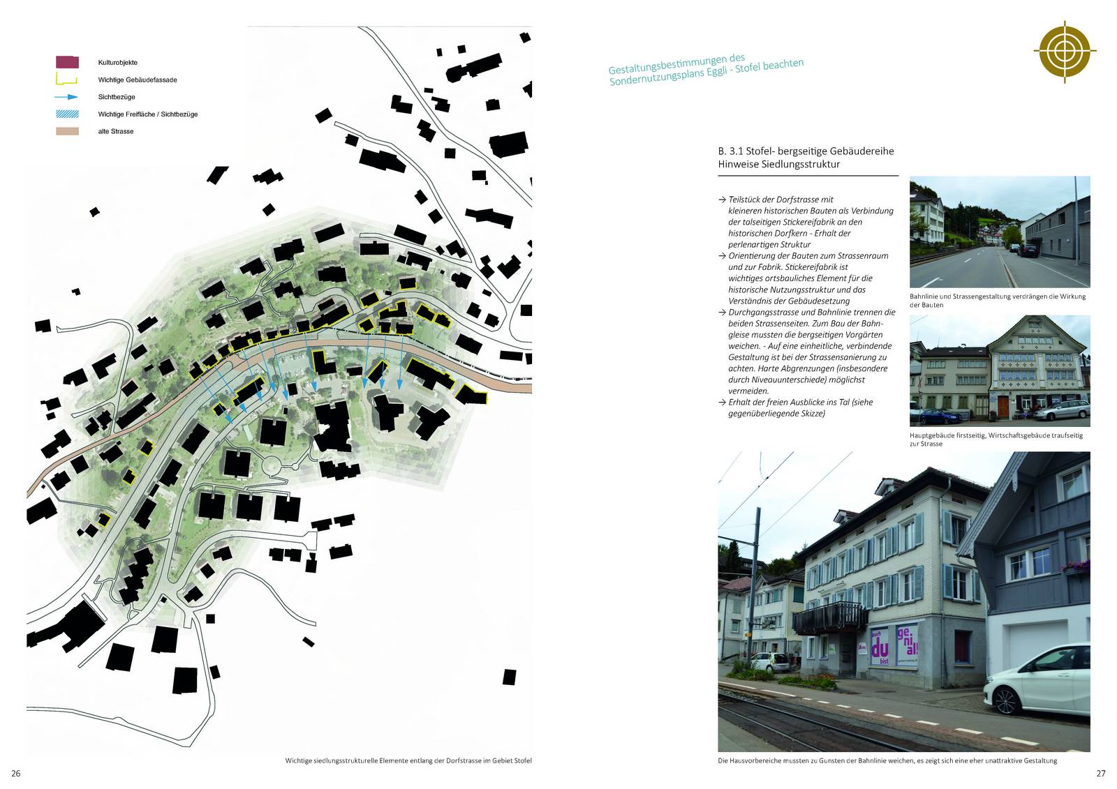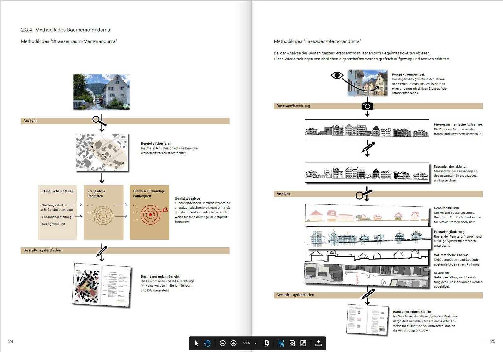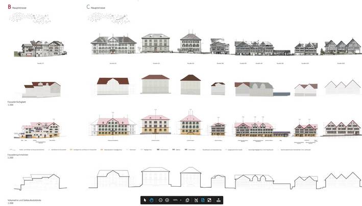 Eine architektonische Analyse des Ortes in Bezug auf vertraute Bilder, Formen, Farben, Silhouetten, Materialien, Konstruktionen und Gebäudestellungen bildet die Grundlage für die Zielsetzungen zur gestalterischen Weiterentwicklung des Ortes.