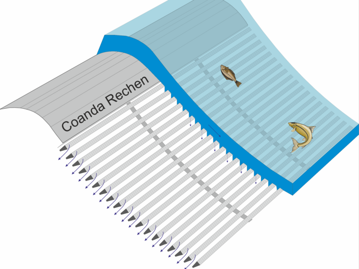 Viel höher ist die Reinigungswirkung eines Coanda-Rechens, denn hier ist der Stababstand «w» bis zu 100 Mal kleiner als beim Tiroler-Wehr (0,2 – 3 mm). Die Stäbe verlaufen quer zur Strömung, und bilden eine abfallende Krümmung. Diese Krümmung ist so gewählt, dass sich das darüber fliessende Wasser daran anhaftet. Von jedem Stab wird eine dünne Wasserschicht abgeschert (wie die Klingen eines Mehrklingenrasierers). Das Anhaften des Wassers ist dem Coanda- Effekt zuzuschreiben, der auf den rumänischen Physiker Henri Marie Coanda (1886 - 1972) zurückgeht. Coanda-Rechen sind für Mittel- und Hochdruckkraftwerke geeignet, nicht aber für Niederdruckkraftwerke (Fallhöhe des Wassers weniger als 15 m). Der Coanda-Rechen bringt nämlich je nach Typ einen Fallhöhenverlust von 0,7 bis 2,2m mit sich – daher wäre sein Einsatz hier unwirtschaftlich.
