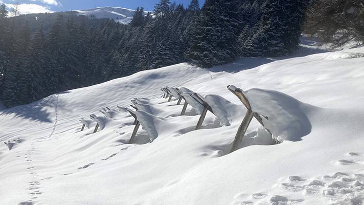 Gleitschneelawinen sind die Folge von kontinuierlichem Schneedeckenkriechen, welches zu einem plötzlichen Versagen der Schneedecke führt (vgl. Abb. 1). Gleitschneelawinen verursachen Schäden an Menschen und Infrastruktur. Zudem kann die Unvorhersehbarkeit der Auslösung von Gleitschneelawinen zu längeren Schliessungen von Skigebieten und Transportwegen führen und damit erhebliche wirtschaftliche Schäden verursachen. Im Zuge der zunehmenden klimatischen Veränderungen und der damit verbundenen höheren Temperaturen nehmen die Gleitschneeprobleme in der Alpenregion zu. Dieses «Proof of Concept»-Forschungsprojekt untersucht, ob reibungsarme Geobaustoffe auf Gleitschneehängen eingesetzt werden können, um angesammelten Schnee in kontrollierbaren Mengen freizusetzen. Entfernbare, reibungsarme Geobaustoffe erlauben im Gegensatz zu traditionellen Massnahmen gegen Gleitschneeprobleme wie Holz-Dreibein-Böcke (vgl. Abb. 2), dass die betreffenden Wiesen in den Sommermonaten landwirtschaftlich genutzt werden können.