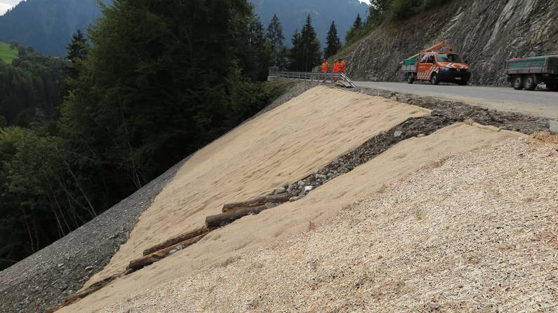 Untersucht wurde, wie sich Schweizer Holzwolle zur Stabilisierung von erosionsgefährdeten Hängen eignet. Auf Testflächen zwischen 500 und 10 000 m² kamen vier Holzwolle‑Typen in Kombination mit zwei Saatmischungen zum Einsatz. Berücksichtigt wurden verschiedene Expositionen und Hangneigungen von 35° bis 70° sowie sehr unterschiedliche Bodenverhältnisse – von fruchtbaren Mutterböden bis zu nährstoffarmen Schotterflächen. Insgesamt wurden rund 50 000 m² Holzwolle‑Vlies in den Kantonen Graubünden, Tessin, Schwyz, Bern, Aargau und Zürich für das Projekt installiert.