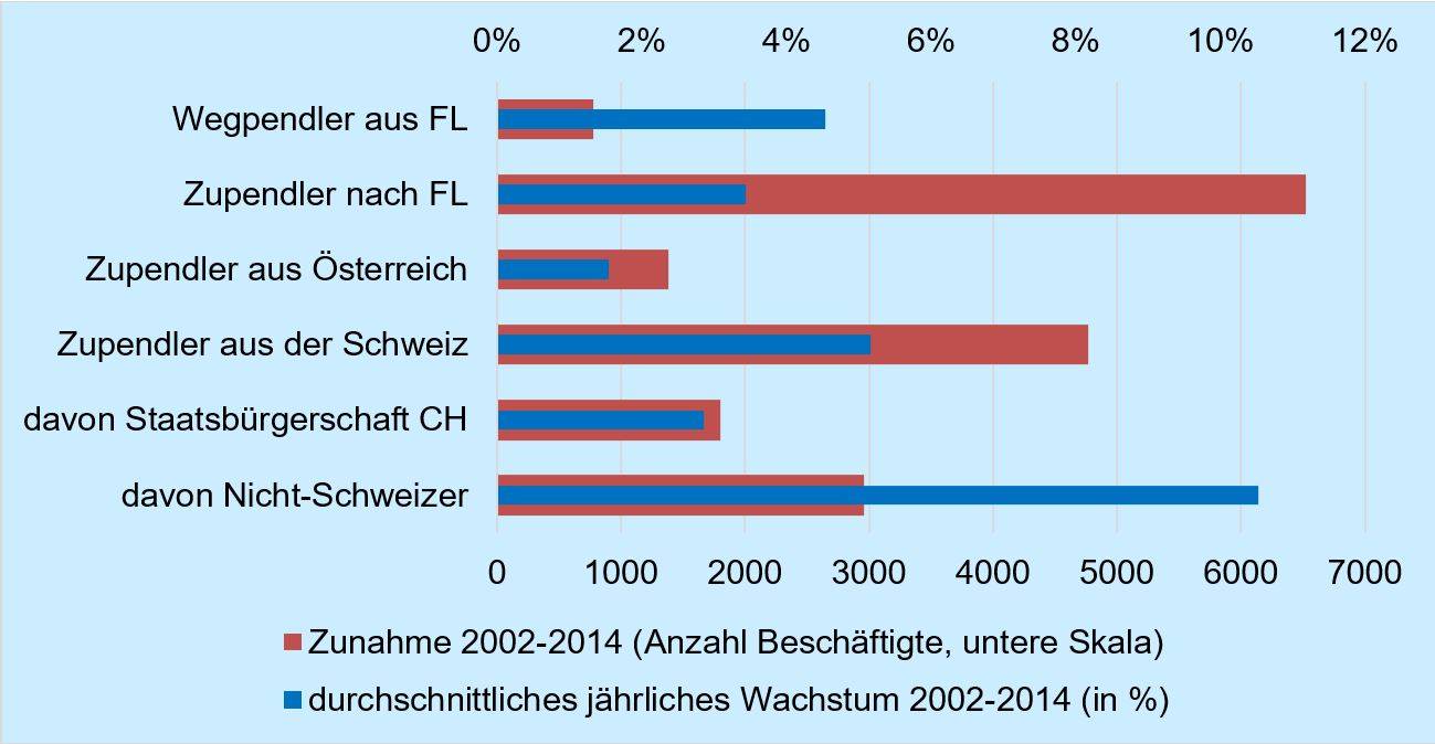 Wie Abbildung 1 verdeutlicht, nahm die Zahl der Zupendlerinnen und Zupendler nach Liechtenstein zwischen 2002 und 2014 um 6’521 Personen zu; knapp drei Viertel dieser Personen stammten aus der Schweiz. Von diesen zusätzlichen Pendlerinnen und Pendlern aus der Schweiz sind ein Drittel Schweizer Bürgerinnen bzw. Bürger, zwei Drittel haben einen ausländischen Pass. Aber auch die Anzahl Wegpendlerinnen und Wegpendler aus Liechtenstein nahm im untersuchten Zeitraum um 776 Personen zu; das durchschnittliche jährliche Wachstum war dabei mit 4,5 Prozent leicht höher als bei den Zupendlerinnen und Zupendlern (3,5 Prozent).