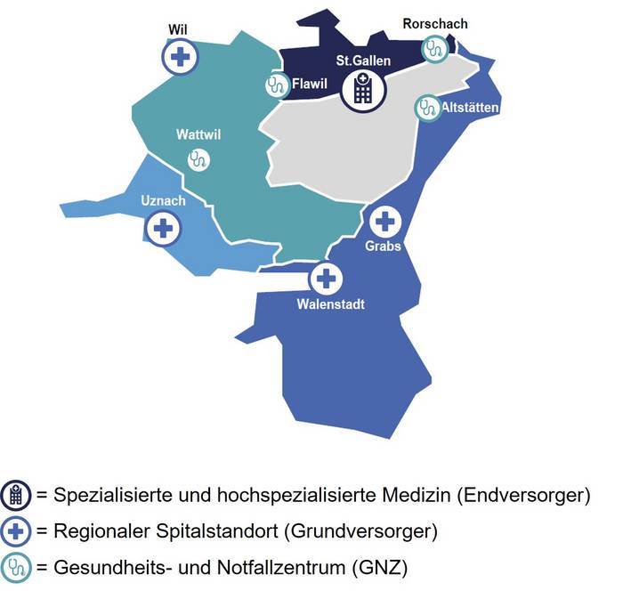Der Kanton St.Gallen will die Qualität und Finanzierbarkeit seiner Spitäler langfristig sichern. Zu diesem Zweck konzentriert er das stationäre Angebot auf die Standorte Grabs, Uznach, Wil und St.Gallen. Die bisherigen Spitäler Altstätten, Wattwil, Flawil und Rorschach werden in ambulante, auf die regionalen Gegebenheiten abgestimmte Gesundheits- und Notfallzentren (GNZ) umgewandelt. Das Spital Walenstadt wird Teil des Kantonsspitals Graubünden.