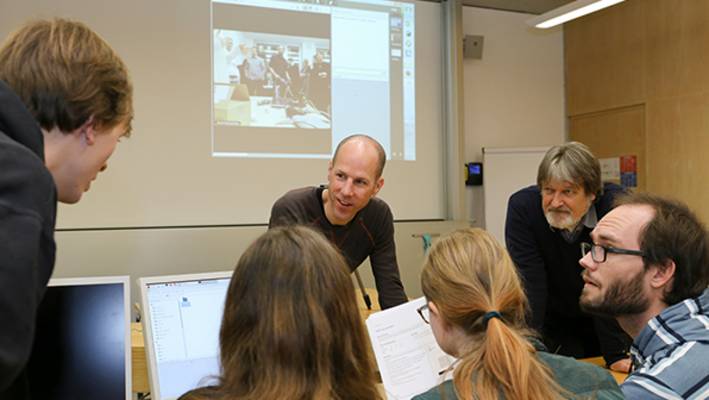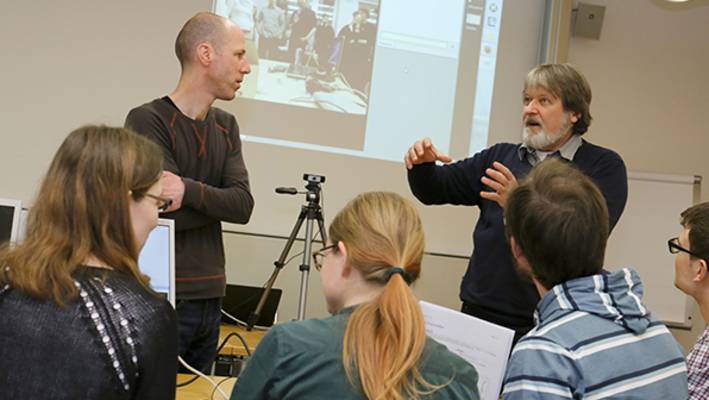 Ein Seminar erfordert mehr Interaktion zwischen den Studierenden untereinander sowie zwischen den Studierenden und der Lehrkraft. Wie könnte der beschriebene Unterricht auf Distanz interaktiver gestaltet werden? Im Bachelor-Studiengang Information Science wurde das interdisziplinäre Seminar zum Thema «Das Potenzial von Linked (Open) Data» zeitgleich mit Studierenden in Zürich und Chur durchgeführt. Prof. Dr. Niklaus Stettler, Professor für Archivwissenschaft und Records Management sowie Leiter des Schweizerischen Instituts für Informationswissenschaft SII, traf sich mit den berufsbegleitend Studierenden in einem Unterrichtszimmer in Zürich und meldete sich – ausgerüstet mit Laptop, Kamera und Mikrofon – im Distributed Classroom an. Derselbe Vorgang war zeitgleich auch in Chur zu beobachten, wo sich Prof. Bruno Wenk, Professor für Multimedia-Kommunikationssysteme, mit den Vollzeit-Studierenden in einem Raum befand. Mit diesem Set-up konnten sich alle Anwesenden sehen und hören.