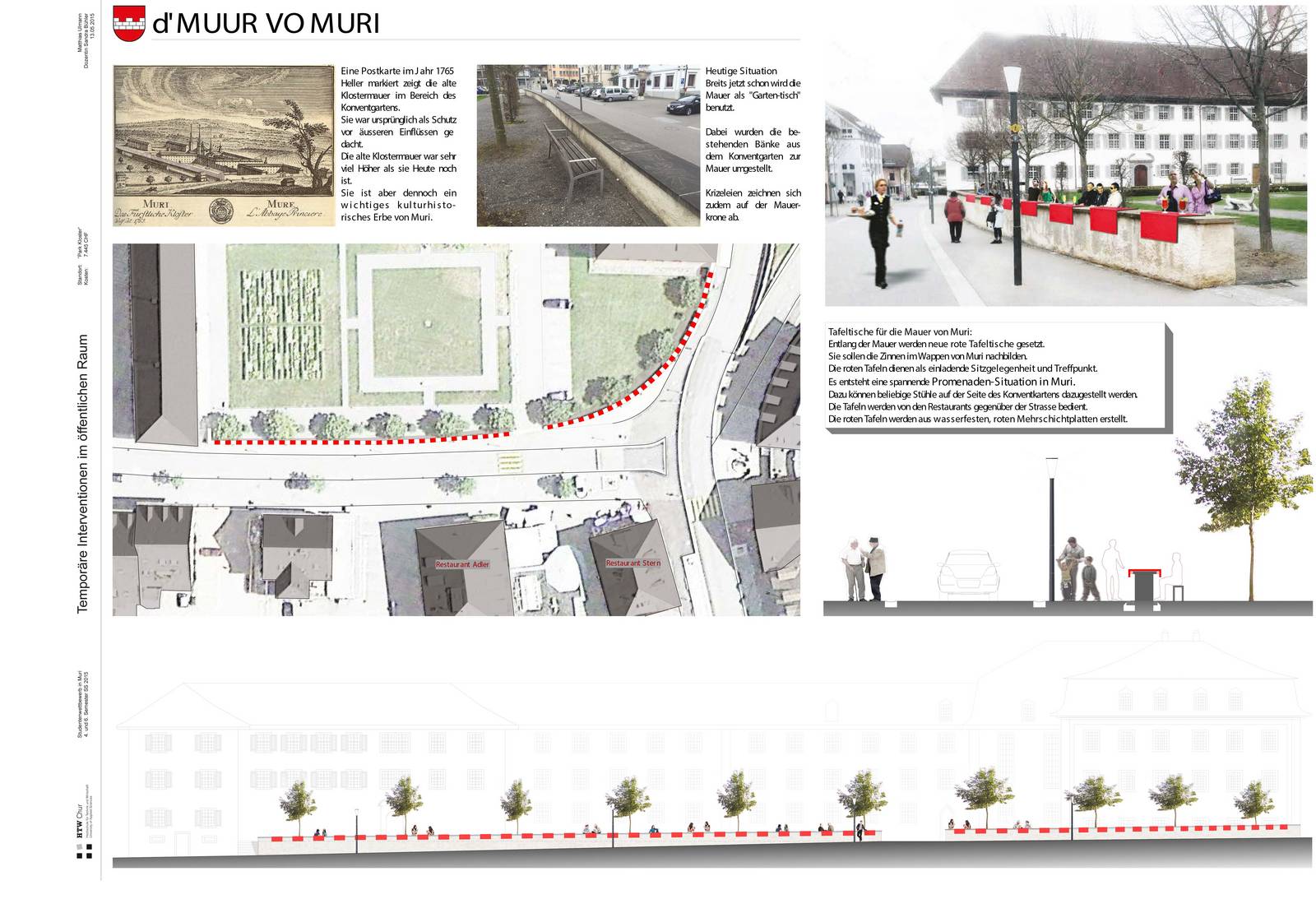 Gesucht waren kostengünstige temporäre Interventionen im öffentlichen Raum für das aargauische Muri, ausgeschrieben als Wettbewerb an Studierende der Disziplinen Architektur, Kommunikation, Kunst und Landschaftsarchitektur.