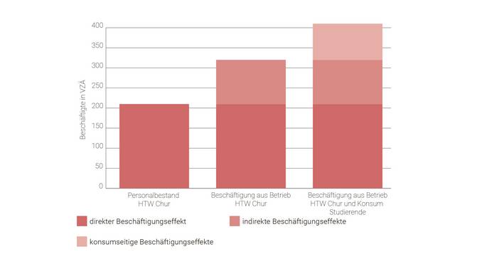 Der kantonale Beschäftigungseffekt der FH Graubünden entsprach im Jahr 2015 einer Zahl von 410 Vollzeitäquivalenten (1) (VZÄ). Auf eine Vollzeitstelle an der Bündner Fachhochschule entfallen 0,9 weitere Vollzeitbeschäftigte in der übrigen Wirtschaft. Die nachgelagerten Effekte entstehen durch Vorleistungsbezüge der FH Graubünden (53 %) und durch Konsum (Löhne FH Graubünden-Personal und Konsum Studierende) (47 %).