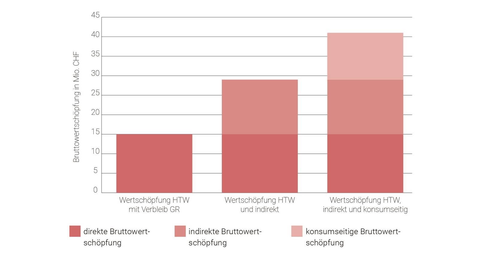 Der direkte Effekt entspricht der Wertschöpfung, welche die FH Graubünden generiert; die indirekten Effekte werden durch Vorleistungsbezüge der Bündner Fachhochschule im Kanton Graubünden ausgelöst. Indirekte und induzierte Effekte können auch als sogenannte Zweit- und Drittrundeneffekte entlang der kantonalen Wertschöpfungskette bezeichnet werden. Ein Beispiel für indirekte Effekte könnte folgendes sein: Die FH Graubünden bezieht im Liegenschaftsunterhalt lokale Leistungen. Das damit beauftragte Unternehmen generiert aus dem Auftrag Wertschöpfung, benötigt aber seinerseits ebenfalls Vorleistungen, welche lokal bezogen werden (2. Runde). Aus diesen Vorleistungen fällt wiederum Wertschöpfung an und es werden abermals Vorleistungen benötigt (3. Runde). Die zusätzliche Wertschöpfung und die Vorleistungen werden mit jeder Runde kleiner. Zur Berechnung der indirekten Effekte wurde die kantonale Wirtschaftsstruktur berücksichtigt, da diese anzeigt, welche Vorleistungen im Kanton bezogen werden können.