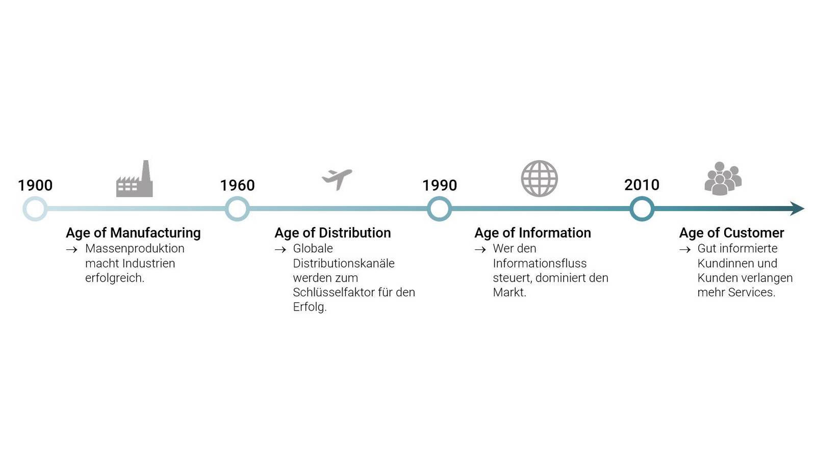 Die moderne Wirtschaftsentwicklung ist von vier Zeitaltern geprägt, die alle von revolutionären technischen und technologischen Entwicklungen ausgelöst wurden. Das aktuelle Zeitalter, «Age of Customer» genannt, wird voraussichtlich eine Phase von schätzungsweise 20 Jahren prägen. Alle vier Zeitalter verhalfen einzelnen Unternehmen zu grossen Erfolgen und zumindest temporären Konkurrenzvorteilen und führten zum Marktaustritt von anderen. Im «Age of Customer» werden Technik und Technologie zum Instrument, die Kundinnen und Kunden besser zu verstehen und zu bedienen. Diese verlangen immer schneller nach billigeren und besseren Dienstleistungen oder Produkten – eine Differenzierung ist nur noch über zusätzliche «smarte» Services möglich (Bernoff, 2011).