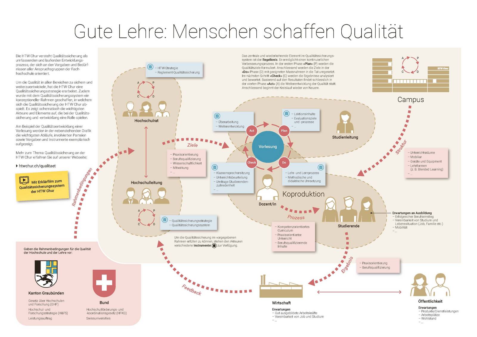 Um die Qualität in allen Bereichen zu sichern und weiterzuentwickeln, hat die FH Graubünden eine Qualitätssicherungsstrategie erarbeitet. Zudem wurde mit dem Qualitätssicherungssystem ein konzeptioneller Rahmen geschaffen, in welchem sich die Qualitätssicherung der FH Graubünden abspielt. Es zeigt schematisch die wichtigsten Akteure und Elemente auf, die bei der Qualitätssicherung und -entwicklung eine Rolle spielen.