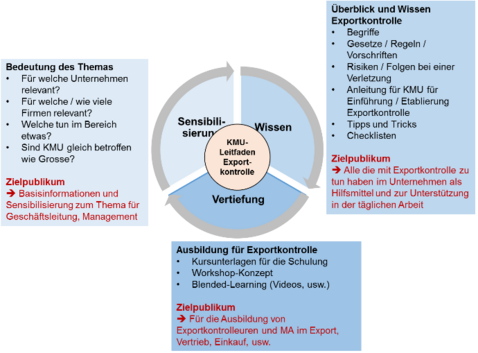 Im Rahmen eines Innosuisse-Projekts hat die FH Graubünden zusammen mit vier KMU als Umsetzungspartnern ein umfassendes Instrumentarium für die Sensibilisierung, Information und Ausbildung von KMU zum Thema Exportkontrolle entwickelt. Zwei der beteiligten KMU waren Hightech-Unternehmen, die exportkontrollierte Produkte herstellen und exportieren. Die beiden anderen KMU waren Beratungsunternehmen im Bereich Exportkontrolle. Die Projektdauer betrug rund zwei Jahre. Das Projekt gliederte sich in zwei Phasen: Die erste Phase beinhaltete die Durchführung einer qualitativen und quantitativen Erhebung bei auslandsorientierten Schweizer Unternehmen zu Fragen der Exportkontrolle, die zweite Phase diente zur Entwicklung eines Leitfadens und eines Schulungs- und Beratungsinstrumentariums für die Sensibilisierung, Information und Ausbildung von KMU im Bereich Exportkontrolle.