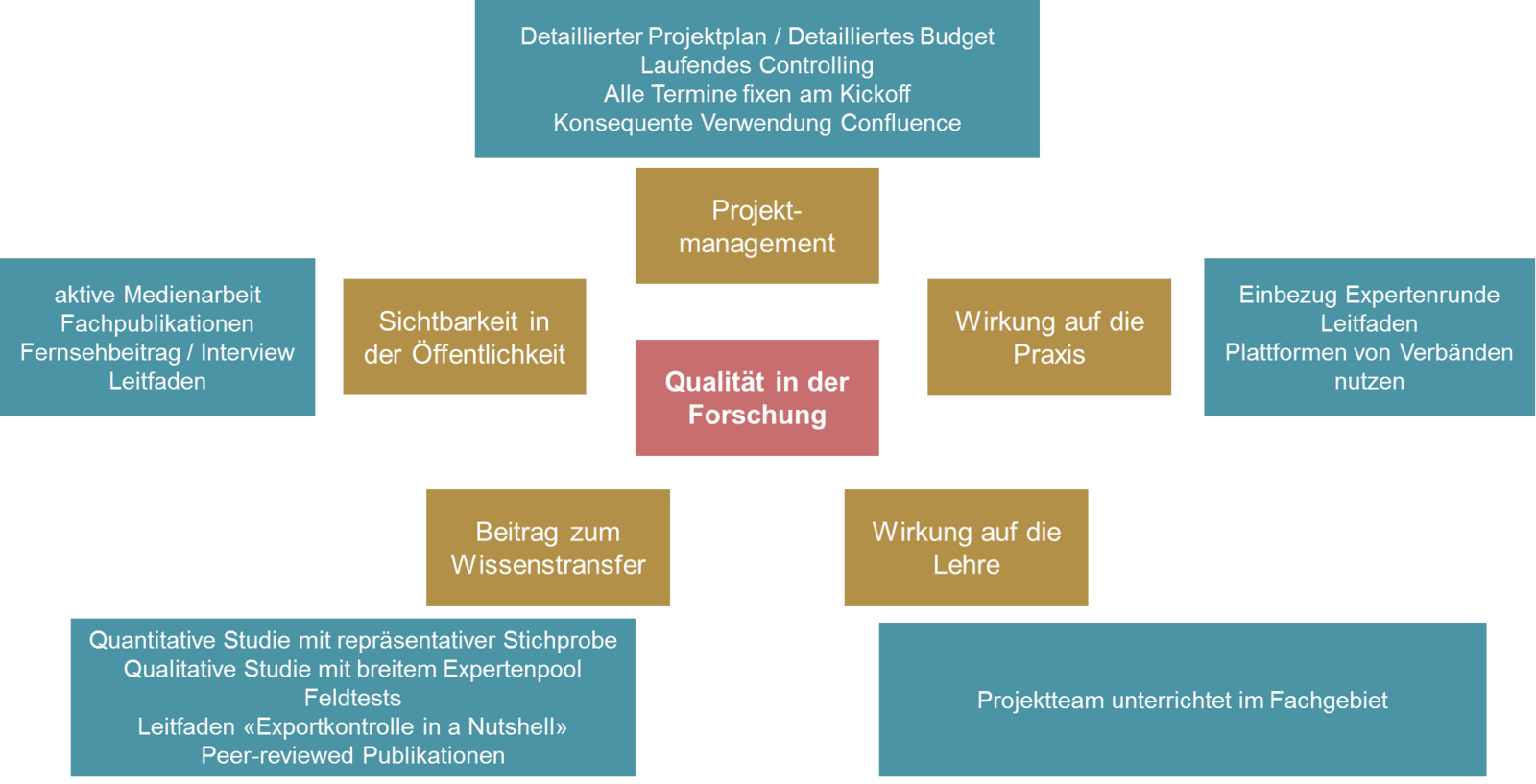 Am Beispiel des Innosuisse-Projekts «Exportkontrolle» wurde aufgezeigt, wie die Qualitätsdimensionen eines Forschungsprojekts konsequent adressiert und umgesetzt werden. Der Erfolg, der diesem Projekt durch die Projektpartner, die Mitglieder der Expertenrunde sowie durch Unternehmen, die nicht am Projekt beteiligt waren, schon vor Ende des Projekts wiederholt attestiert wurde, verdeutlicht die Wirksamkeit dieser konsequenten Projektarbeit.
