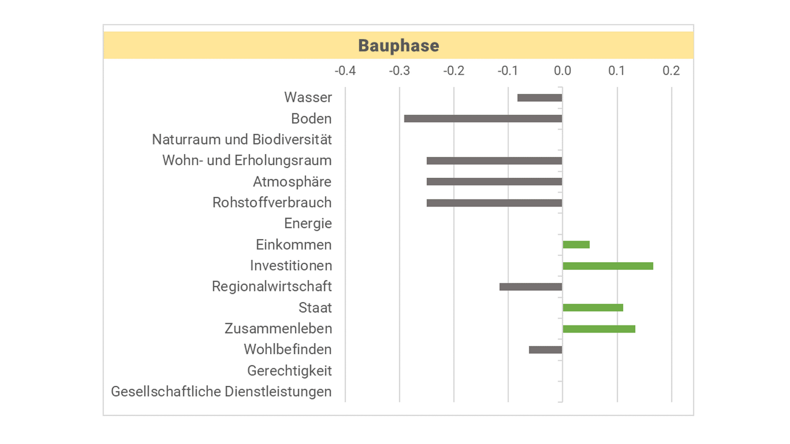 Der Erfolg dieses Stakeholder-Prozesses von 2008/2009 kann auch anhand der im Rahmen des laufenden NFP70-Projekts durchgeführten NHB betrachtet werden. Diese verdeutlicht die «Optimierung» des Projekts durch den Stakeholder-Dialog. Wie in Abb. 2 und Abb. 3 veranschaulicht, wurden die Auswirkungen auf die meisten Kriterien und Teilbereiche damals positiv bewertet. Sie erscheinen also mehrheitlich in grüner Farbe, insbesondere für die Betriebsphase. Mit negativen Auswirkungen ist hauptsächlich im Umweltbereich, während der Bauphase, zu rechnen.