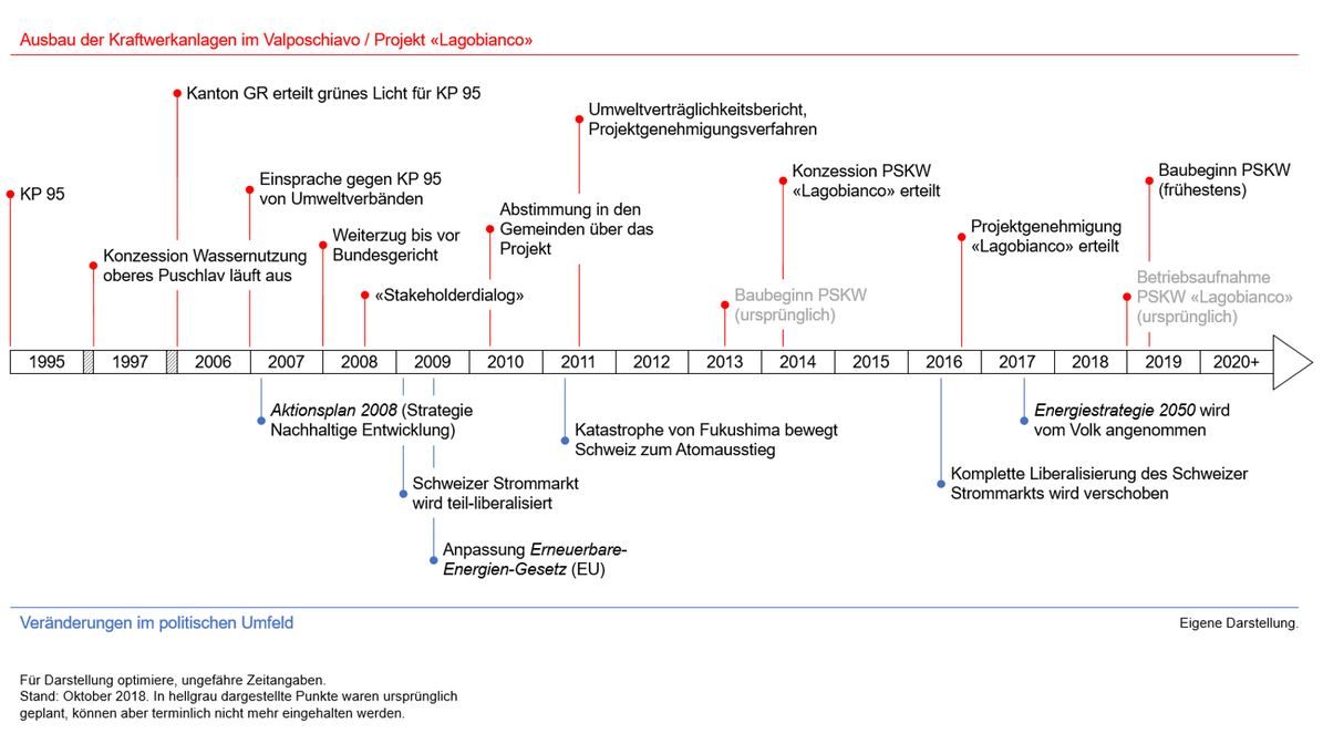 Der Ursprung des heutigen Projekts «Lagobianco» liegt über 30 Jahre zurück und beginnt mit den ersten Plänen für einen Grossausbau der Kraftwerkanlagen (vgl. Abb. 1). Schon bevor die Konzessionen für die Nutzung der Gewässer zur Stromproduktion im oberen Puschlav Ende 1997 ausliefen, gab es Pläne zur Erneuerung bzw. zum Ausbau der bestehenden Anlagen, die damals aus ökonomischer Sicht sehr rentabel erschienen. So entstand das Ende 1994 vorgestellte «Konzessionsprojekt 95 (KP 95)» der damaligen Rätia Energie AG. Kern dieses Projekts waren neben der Konzessionserneuerung insbesondere der Ausbau des Speichersees Lago Bianco mit einer geplanten Erhöhung der Staumauer um 17 Meter sowie die verstärkte Nutzung der Anlagen im Winter.