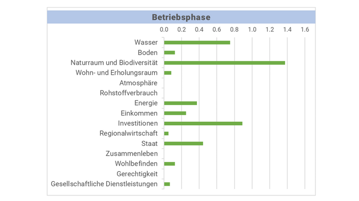 Abb. 3: Die Beurteilung der Betriebsphase fällt ausnahmslos neutral oder positiv aus. Im überarbeiteten Projekt wurden sämtliche Umweltbedenken, die zuvor geäussert worden waren, miteinbezogen. Regionalwirtschaftlich wird die Betriebsphase ebenfalls von Bedeutung sein, da neue Stellen im Betrieb und Unterhalt geschaffen werden. (Grafik: Marc Herter)