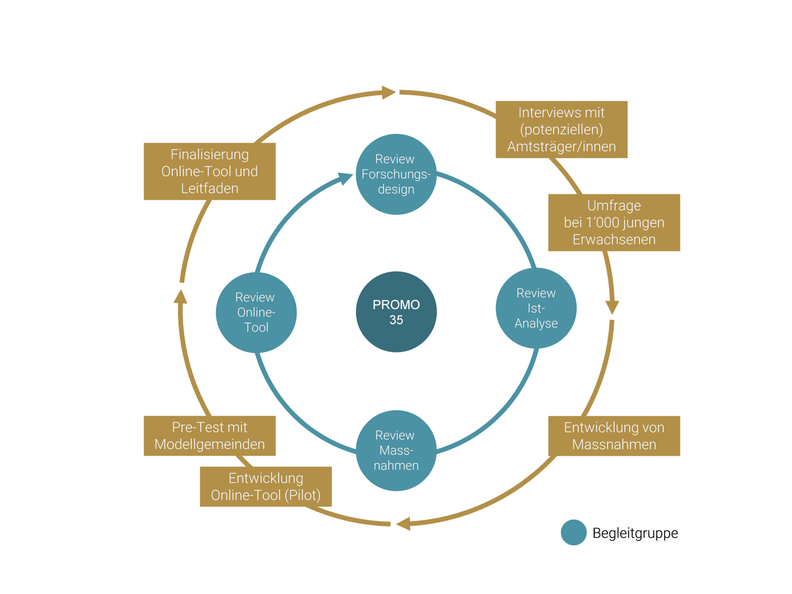 Aus diesem Grund bezieht das Forschungsdesign von PROMO 35 Vertreterinnen und Vertreter unterschiedlicher Perspektiven ein. Dazu wurden zum einen potenzielle, aktuelle und ehemalige Mitglieder von Gemeindeexekutiven, die zwischen 20 und 35 Jahre alt sind, zu ihren Bedürfnissen befragt. Zum anderen nahmen über 600 Gemeinden aus der Deutschschweiz an einer Umfrage teil und beurteilten u.a. die Wirksamkeit möglicher Massnahmen. Auch wurden ausgewählte Unternehmen befragt, da sie junge Erwachsene in ihrer Entscheidung, ein öffentliches Amt in der Gemeinde zu übernehmen, mitbeeinflussen. Auf Grundlage der Befragungsergebnisse wurden konkrete Massnahmen in Zusammenarbeit mit ausgewählten Praxispartnern und mit den Gemeinden selbst (Modellgemeinden) im Rahmen einer Projektbegleitgruppe abgeleitet und getestet. Die daraus gewonnenen Erkenntnisse wurden den Gemeinden – als Hauptzielgruppe – sowie der breiten Öffentlichkeit über promo35.ch zugänglich gemacht.