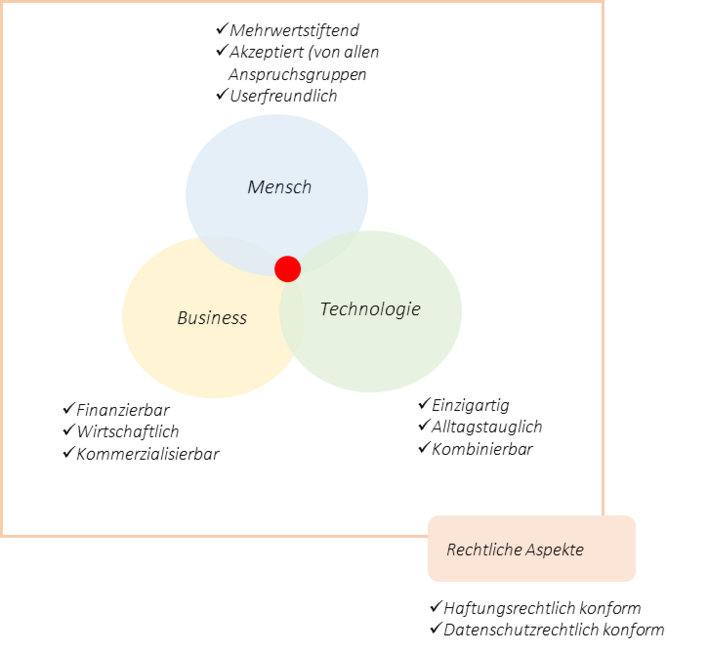 Mittels geeigneter Methoden werden pro Einsatzfeld Technologien ausgewählt, welche die gewünschte Wirkung entfalten. Dabei werden einerseits eigenständige Robotersysteme beschafft, andererseits aber auch Applikationen für die bestehenden Assistenzroboter des Wirtschaftspartners entwickelt. In einer ersten Testreihe wird anschliessend ein Teil der Infrastruktur des Altersheims (Betagtenzimmer, Gang, Serviceraum, Bad, Stationszimmer) 1:1 im Labor nachgebaut. Wichtig ist hierbei, dass die Physik der Infrastruktur analog zu jener im Altersheim ist (Materialien, Abstände, Türen, Wände). Ansonsten würden sich die Robotersysteme in der realen Umgebung nicht zurechtfinden. Sobald diese Infrastruktur bereitgestellt ist, werden die Einsatzfelder mit Studierenden getestet. Im Zentrum dieser Tests steht immer die Frage, ob das betreffende Einsatzfeld «wünschbar», «machbar», «wirtschaftlich» und «rechtskonform» ist (vgl. Abbildung 1).