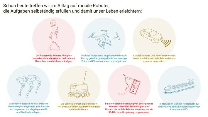 Die grösste Verbreitung von mobilen Robotern findet sich im Bereich der Logistik. Nicht nur auf der Strasse, auch auf dem Wasser und in der Luft werden Transportaufgaben zunehmend von Robotern abgewickelt – etwa mit autonomen Containerschiffen oder Lieferdrohnen. Als Autofahrer hat man sich längst an Fahrassistenzsysteme gewöhnt, die immer mehr Aufgaben übernehmen. Diese Entwicklungen sind Schritte in Richtung teilautonomes und autonomes Fahren. In der Landwirtschaft werden Drohnen eingesetzt, um den Pflanzenstatus aus der Luft zu beurteilen, und mobile Roboter, welche die bedarfsgerechte Ausbringung von Dünger ermöglichen. In der Umweltüberwachung vermessen und kartieren Drohnen Ausdehnungen von Gletschern aus der Luft. Schwimmende Roboter messen auf den Ozeanen die Wassertemperatur und den CO2-Gehalt oder suchen nach Schadstoffen. Auch im Servicebereich setzen sich Roboter immer mehr durch: Sie reinigen den Boden, mähen das Gras, informieren Gäste auf einer Messe oder bewachen nachts ein Werksgelände. Auch das Militär ist zunehmend an mobilen Robotern interessiert. Hier stehen angesichts der technischen Möglichkeiten aber auch ethische Fragen im Vordergrund: Inwieweit darf ein autonomes Waffensystem zum Beispiel eigenständig über das Töten von Menschen entscheiden?