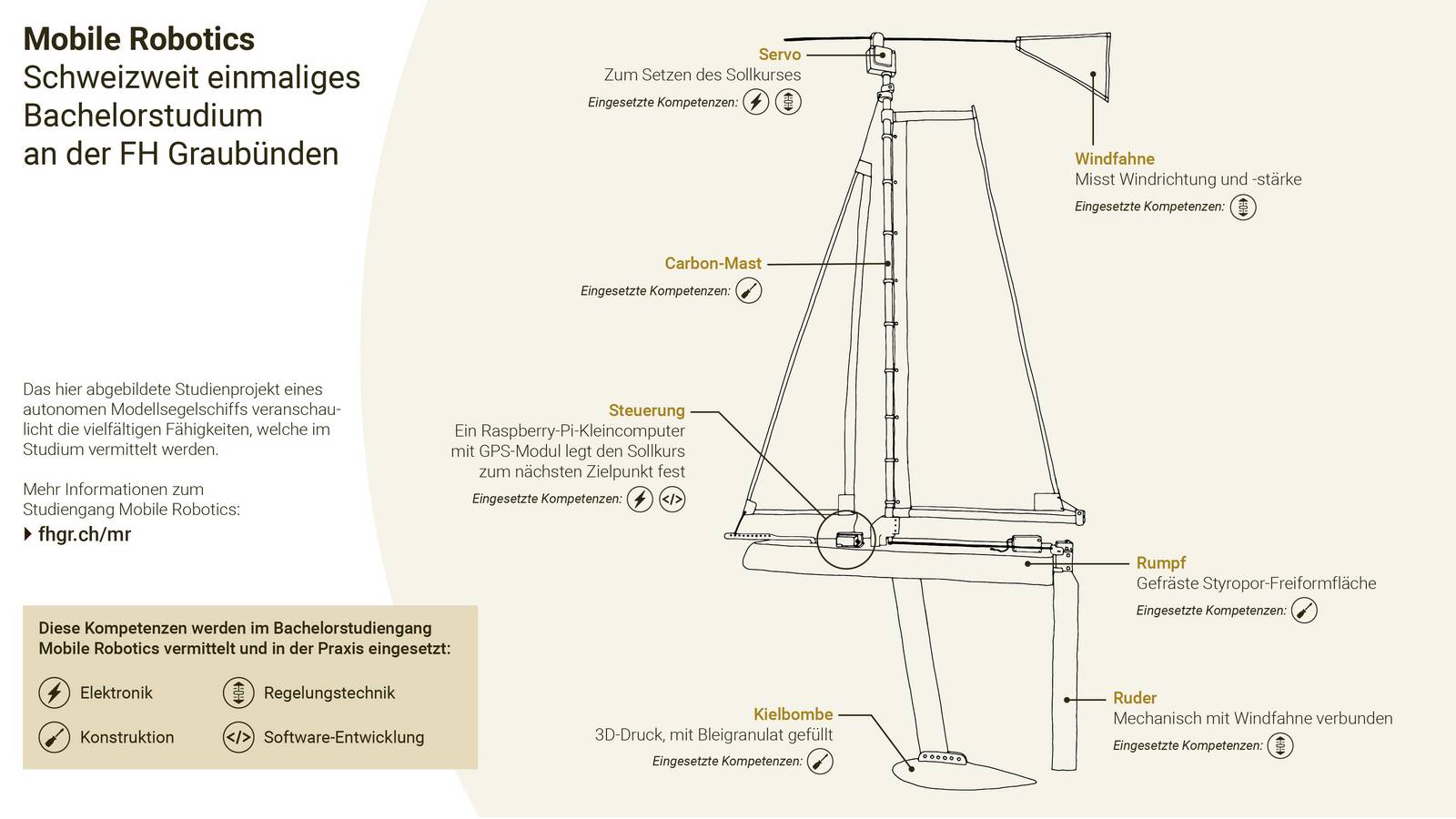 Die Fachhochschule Graubünden bietet ab Herbstsemester 2020 die schweizweit einzigartige Bachelorstudienrichtung Mobile Robotics an. Die Studierenden erhalten eine breite Ausbildung in Grundlagenfächern, Maschinenbau, Elektronikentwicklung und Embedded-Software-Entwicklung. Mit hohem Praxisanteil lernen sie, mobile Roboter zu designen und zu bauen. Die dabei vermittelten Fähigkeiten der einzelnen Fachgebiete und des übergreifenden systemischen Denkens werden in der Schweizer Industrie dringend gebraucht und sorgen für beste Berufsaussichten in den Bereichen Embedded-Software-Entwicklung, Mobile Robotik, Automatisierung und Projektleitung von komplexen technischen Systemen.