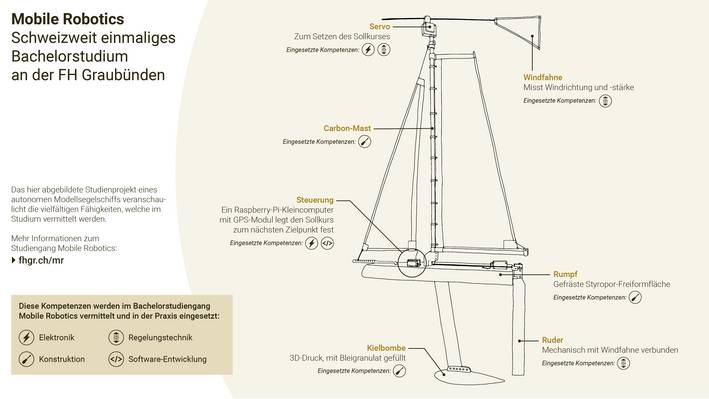 Im Rahmen eines Projektes mit Studierenden wurde an der FH Graubünden ein kleines Segelschiff gebaut, welches autonom einem abgesteckten Kurs folgen kann: Ein Raspberry-Pi als Boardrechner mit einem GPS-Empfänger legt den Sollkurs zum nächsten Zielpunkt fest und entscheidet, ob das Ziel direkt angefahren werden kann oder ob gegen den Wind gekreuzt werden muss. Der Sollkurs zum Wind wird dann mittels einer mechanischen Windsteueranlage gehalten, bis wieder ein Kurswechsel ansteht. Ein erster Testlauf auf dem Lai da Marmorera war erfolgreich. Zur Feuertaufe des Segelboots gibt es einen Film: fhgr.ch/mr