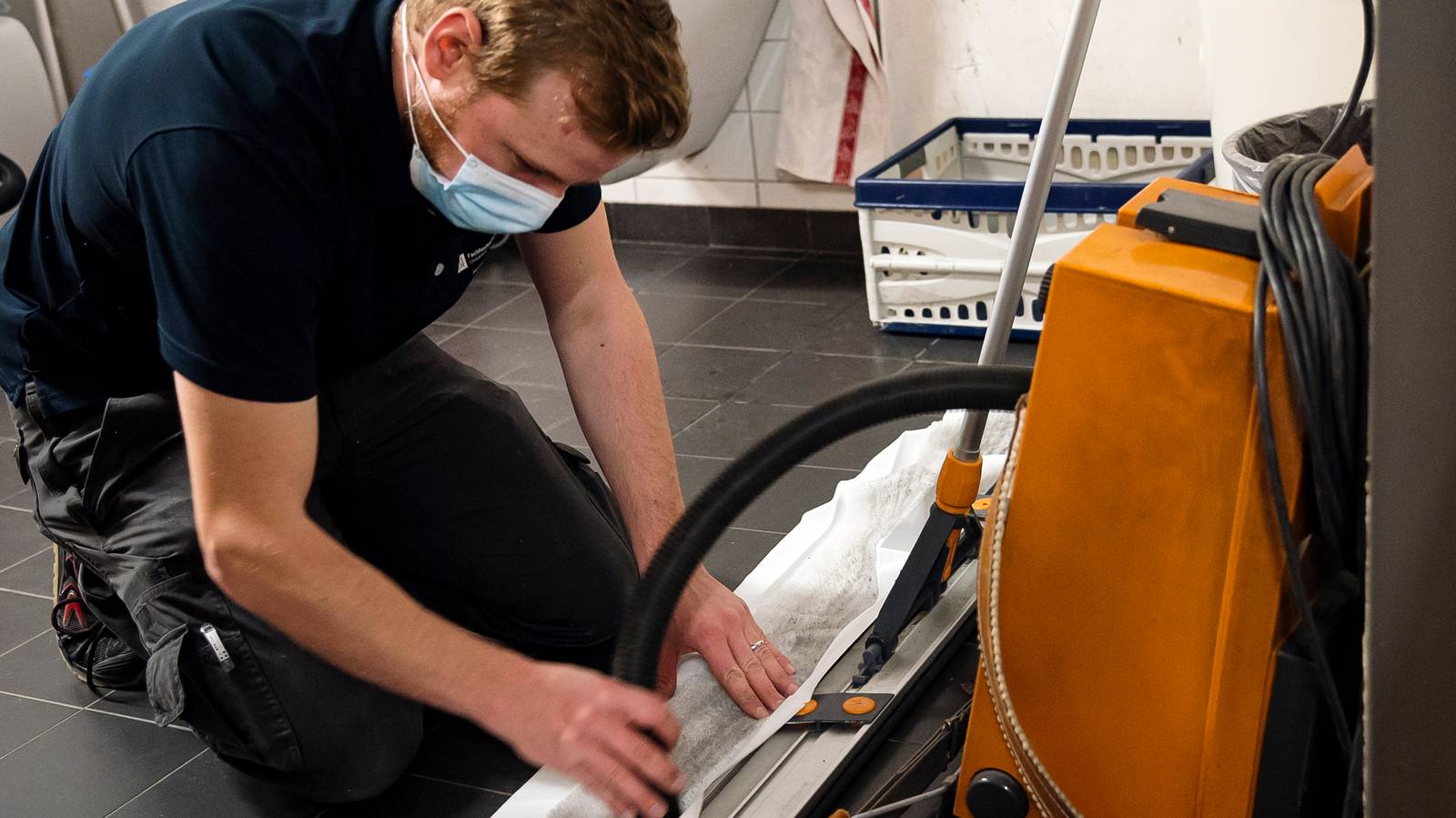 Die meiste Zeit ist der Hauswart jedoch im ganzen Gebäude unterwegs, sogar an zwei verschiedenen Standorten: vormittags an der Comercialstrasse am Standort H und nachmittags im Hauptgebäude an der Pulvermühlestrasse. Dort verrichtet er jeweils verschiedene Aufgaben, je nachdem, was gerade ansteht. Einmal pro Tag werden alle Böden im Gebäude feucht von Hand gewischt, um lose Verschmutzungen zu entfernen. Alle zwei Wochen werden sie dann maschinell nass gewischt. Die Geräte werden nach dem Gebrauch immer gleich gereinigt, damit sie für die nächste Verwendung bereitstehen.