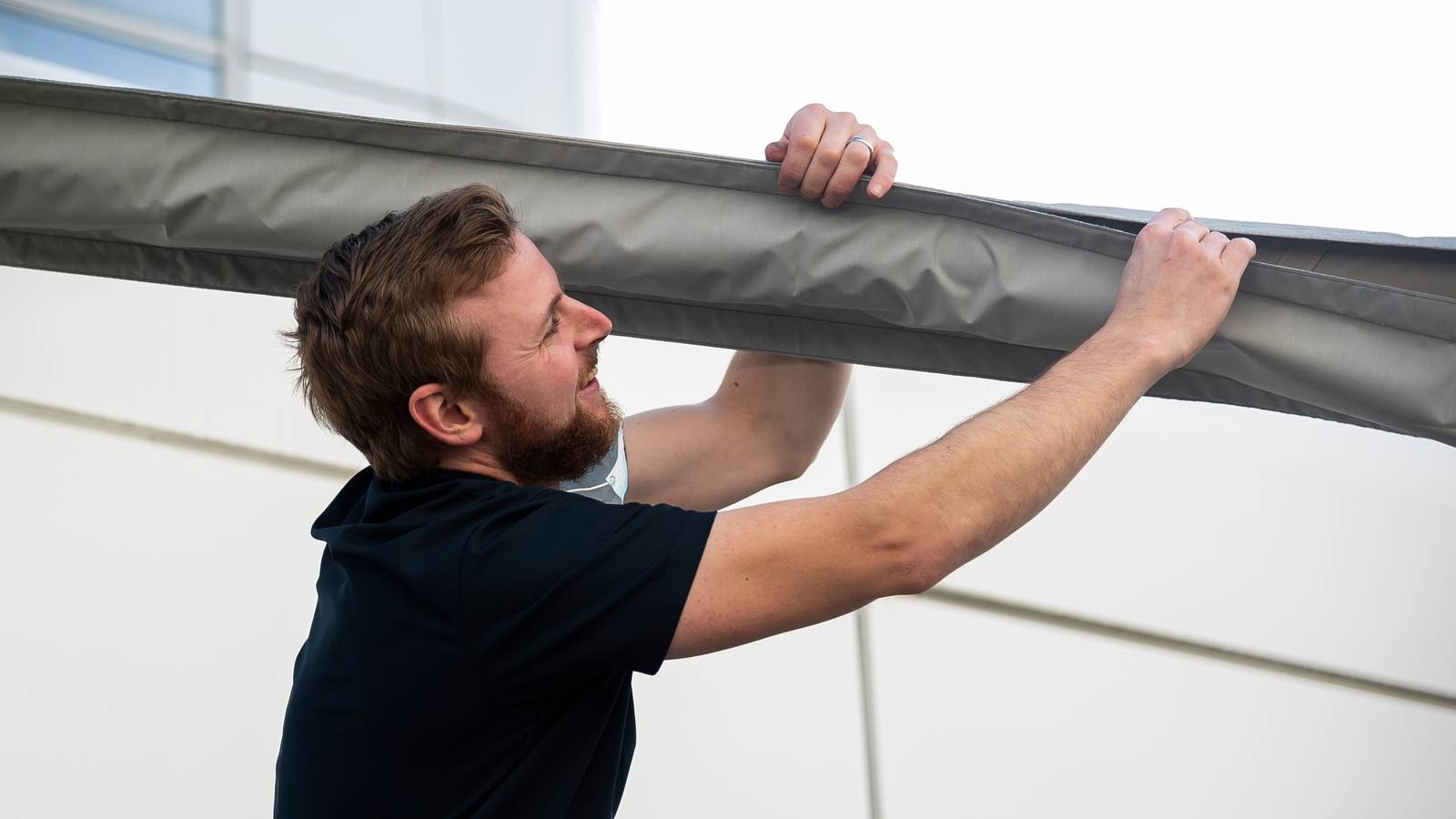 Auch die neuen Sonnensegel beim Aussenplatz am Standort H müssen im Herbst winterfest gemacht werden. Diese werden möglichst wasserdicht eingepackt. Viele dieser Arbeiten werden im Team ausgeführt oder abwechselnd zwischen den verschiedenen Kollegen aufgeteilt. Die Services bestehen aus sechs Mitarbeitenden, wobei Rinaldo Albertin der Leiter ist. Da sie alle unterschiedliche Ausbildungen haben, ergänzen sich die Teammitglieder gut und teilen ihre Aufgaben dementsprechend auf.