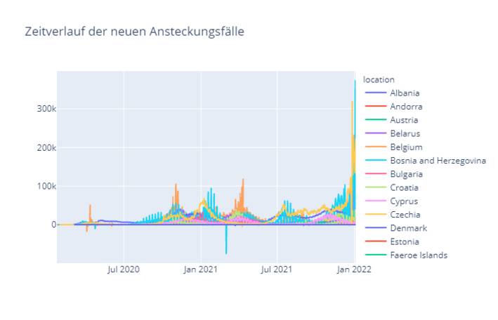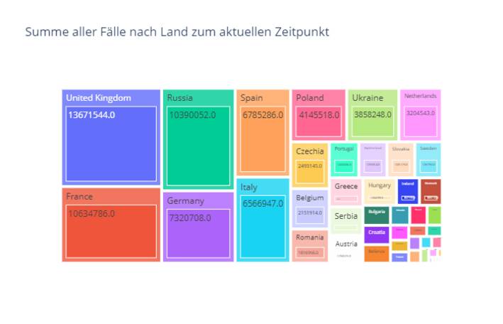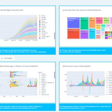 Mithilfe von Visualisierungen in Form sogenannter Dashboards werden komplexe Sachverhalte sichtbar gemacht; Programmierung und Softwareentwicklung lernen und üben die Studierenden so quasi «nebenbei». Themen und Datenbestände ergeben sich aus aktuellen Thematiken und Forschungsprojekten sowie aus Vorschlägen der Studierenden selbst. Ein Beispiel hierfür ist die interaktive Visualisierung von COVID-Daten (Abbildung 1) durch ein Studierendenteam (A. Bednarzewska, S. Clavadetscher und L. Reinhold). Diese Daten wurden im Rahmen des Kurses Dynamic User Interfaces erstellt. Sämtliche Parameter wie Datengrundlage, Zeitraum usw. lassen sich interaktiv beeinflussen.
