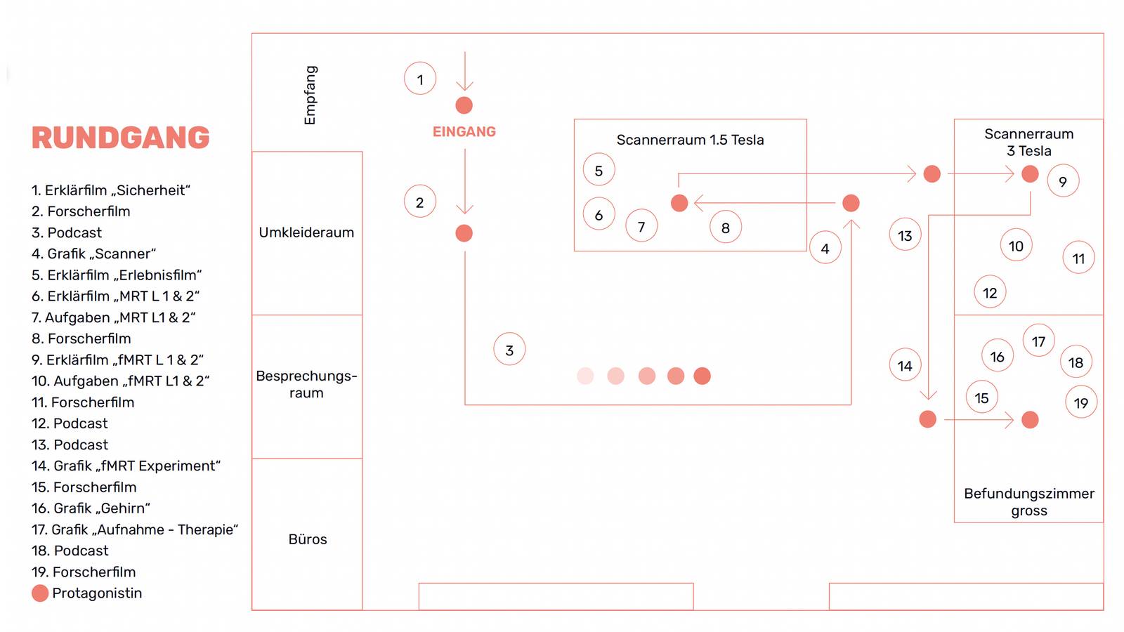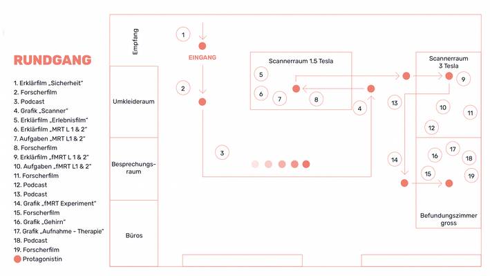 Während des Rundgangs interagiert die Protagonistin mit der Umgebung: Sie durchläuft dabei die einzelnen Vorbereitungsstufen für eine MRT-Messung (Klinikkleidung anziehen, metallische Gegenstände ablegen, Einverständniserklärung unterzeichnen), bevor sie sich selbst in den MRT-Scanner legt, um gemessen zu werden. Zwischendurch richtet sie sich an die Besucherinnen und Besucher und erläutert kurz einzelne Aspekte des Ablaufs.