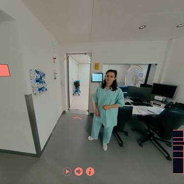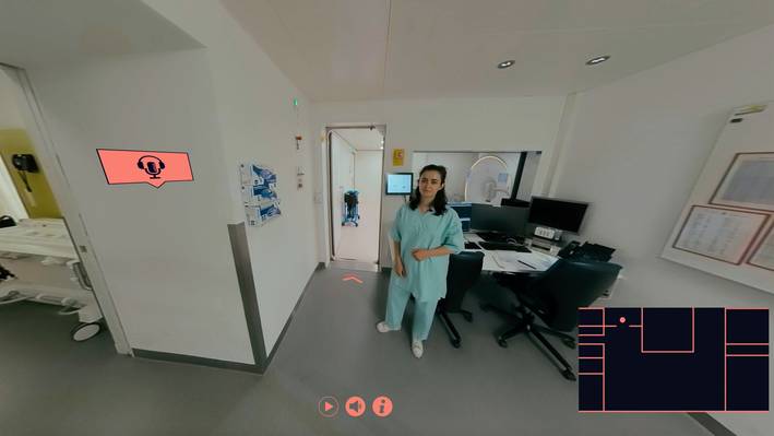 Die Thematik der Magnetresonanztomographie ist sehr komplex. Damit die Zielgruppe ‒ Schülerinnen und Schüler der Gymnasialstufe ‒ sich der Materie altersgerecht nähern kann, werden diverse multimediale Produkte erstellt. Diese interaktiven Inhalte sind in einem VR-Raum, der aus 360-Grad-Aufnahmen mittels Vista3d-Software zusammengesetzt ist, erfahrbar. Die Besucherinnen und Besucher werden von einer Protagonistin abgeholt und auf die interaktiven Elemente in der Umgebung aufmerksam gemacht. Durch einen einfachen Klick auf einen «Hotspot» erfährt man beispielsweise anhand von Filmen, wann und warum man überhaupt zum Scannen muss, wie die einzelnen Methoden funktionieren, wie Experimente im MRT-Scanner durchgeführt werden und wie es sich anfühlt, im MRT-Scanner vermessen zu werden. Ausserdem finden sich im virtuellen Raum verschiedene interaktive Grafiken, welche zum Beispiel einen zerlegbaren 3D-MRT-Scanner zeigen oder einen Einblick in Experimente und in die Weiterverarbeitung und -verwendung der Daten in der Forschung und im Klinikalltag gewähren. Daneben kommen verschiedene Akteure aus dem MRT-Bereich zu Wort: Forschende aus Zürich, Tübingen, München und Bordeaux berichten in Zoom-Videos von ihrer Arbeit und verschiedene Berufsleute wie etwa eine Radiologin, ein Medizinphysiker, eine Wirbelsäulenchirurgin und ein Radiologiefachmann geben in Podcasts Einblicke in ihr Tätigkeitsgebiet. Damit nicht nur passiv konsumiert wird, sollen die Schülerinnen und Schüler auch spielerische interaktive Aufgaben zum Thema lösen. All diese multimedialen Produkte erwecken das VR-MRT-Labor zum Leben, und erlauben ein phasenweise immersives Erleben der Thematik.