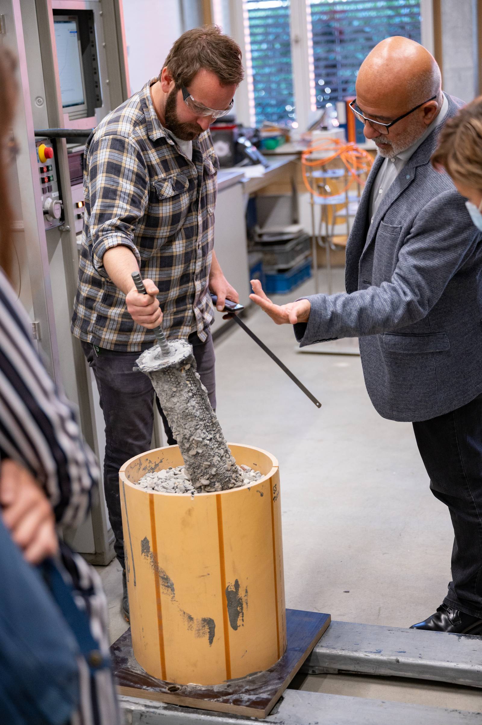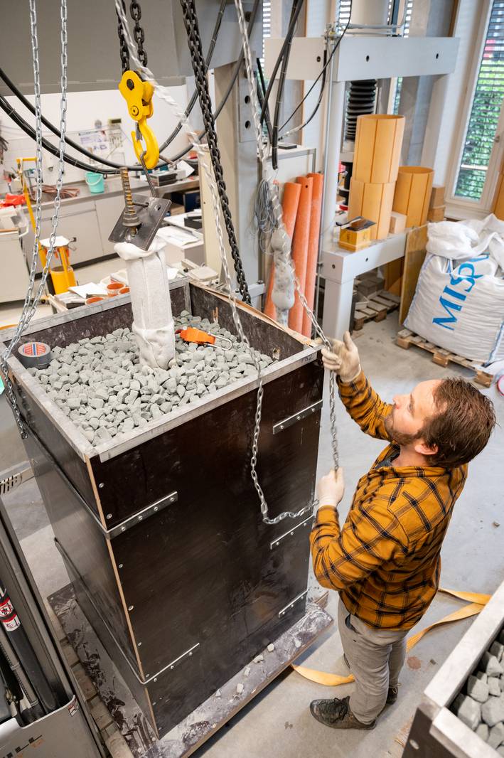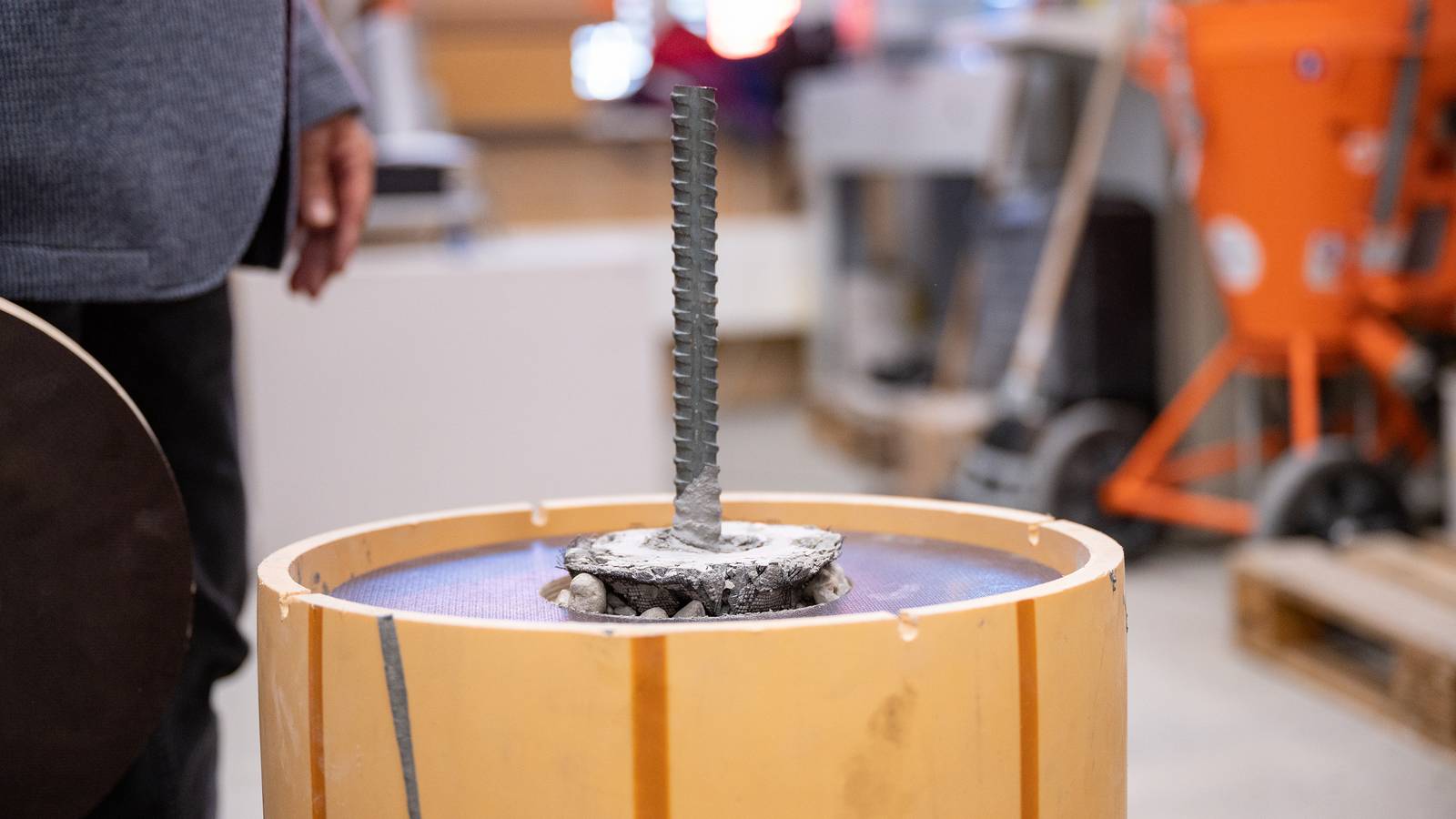 Schliesslich wurden Labortests entwickelt, um die Verbundfestigkeit der verpressten Geotextilsäcke mit dem umgebenden Boden zu testen. Ähnlich wie ein Korken in einer Flasche wurden die verschiedenen Geotextilsäcke in Kies gesetzt und mittels Einsatz der Universalzugmaschine im Baulabor des IBAR durch ein definiertes Scherloch herausgezogen. Das Scherloch zwang den Anker, entlang des Verbundkontakts mit dem umgebenden Boden zu versagen. Auf diese Weise konnte die Verbundfestigkeit der einzelnen geotextilen Ankersysteme bestimmt werden. Es zeigte sich sofort, dass Geotextilsäcke, welche den Austritt von Mörtel verhinderten, eine sehr geringe Haftfestigkeit aufwiesen. Geotextilien, welche eine kleine Menge an Mörtel passieren liessen, schnitten am besten ab. Dies zeigt, dass eine gewisse Durchlässigkeit für ihren Erfolg wichtig ist.