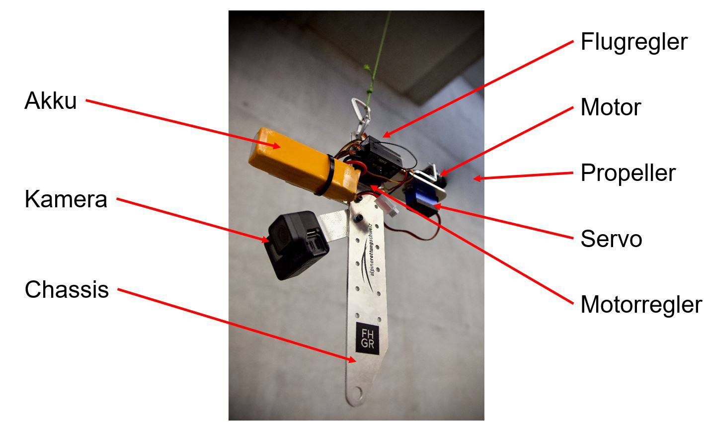 Die Studierenden arbeiteten bei diesem Projekt in Dreier- oder Viererteams und erhielten jeweils einen Satz Hardware (Bild 2). Dieser beinhaltete Motor, Propeller und Motorregler für den Antrieb, Servomotor und Flugregler für die Stabilisierung der Position, Akku und Chassis sowie eine Kamera und einen Distanzsensor (nicht abgebildet).