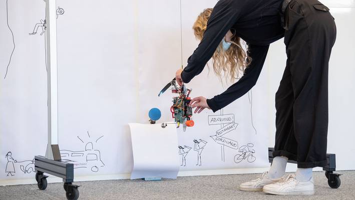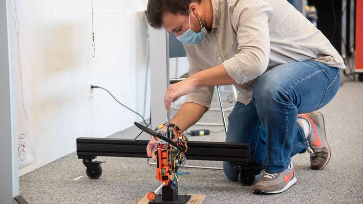 Wurde die Position der Figur erkannt, musste ein ausgeklügeltes Regelungssystem den Prototypen autonom zur Figur leiten. Der Abstand wurde mit einem Time-of-Flight-Sensor gemessen. Vor dem Kontakt mit der Figur musste das System rechtzeitig abgebremst werden – denn die Vorgabe der Studienleitung war, dass die Playmobilfigur an einer Tischkante stehen musste und nicht hinunterfallen durfte.