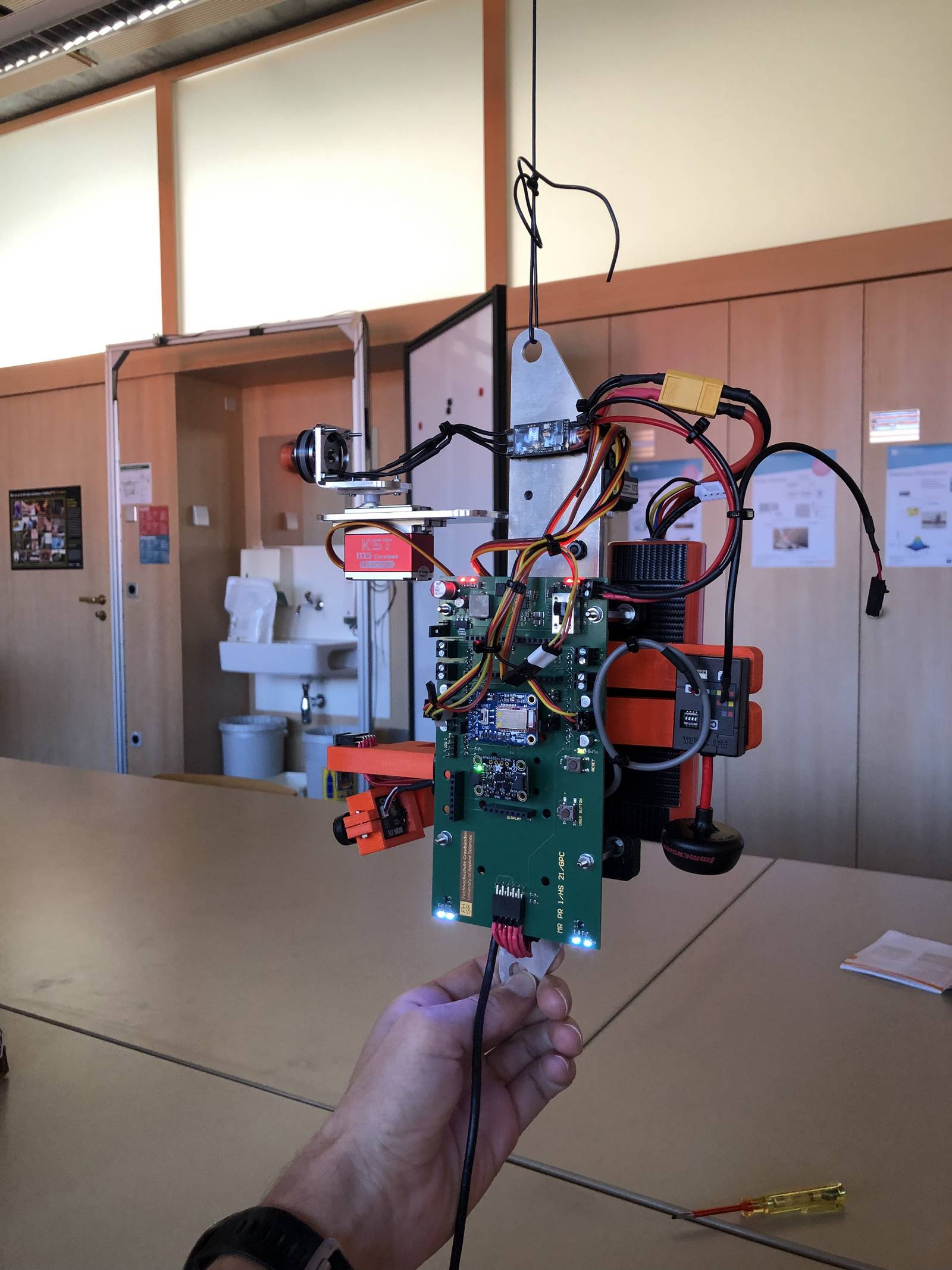 An einem ersten Meilenstein-Meeting mussten die Studierenden den Dozierenden demonstrieren, dass alle Hardwarekomponenten angesteuert werden können und das System sicher betrieben werden kann. Dabei wurde der Prototyp in einen Schraubstock eingespannt; erst nach erteilter Freigabe durften die ersten Versuche am Seil durchgeführt werden. Zudem mussten auch Sicherheitsfunktionen eingebaut worden sein – das System musste beispielsweise bei der Überschreitung einer kritischen Beschleunigung (unkontrolliertes Flugverhalten) automatisch den Motor ausschalten.