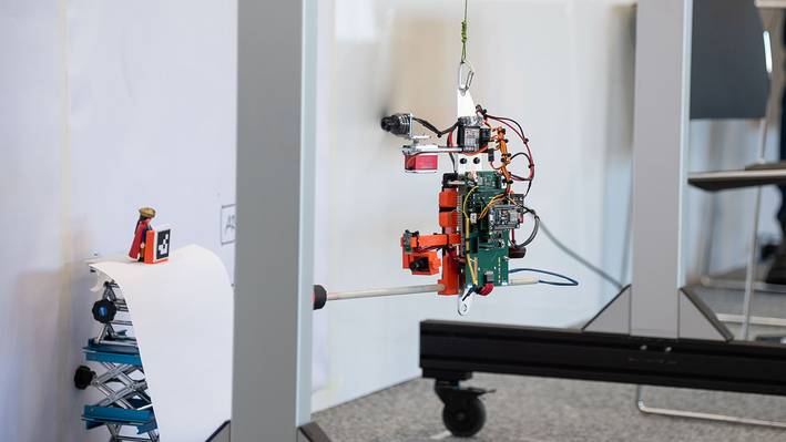 Die Aufgabe bestand darin, dass der Prototyp an einer Leine aufgehängt wird und dann autonom, das heisst nach Betätigung eines Startknopfs, die Playmobilfigur findet, sich dieser nähert und sie rettet. Damit die verschiedenen Hardwarekomponenten miteinander als System funktionieren, müssen im ersten Schritt Softwaretreiber geschrieben werden. So können dann zum Beispiel die Motorleistung angepasst oder die Daten der Beschleunigungssensoren ausgelesen werden.