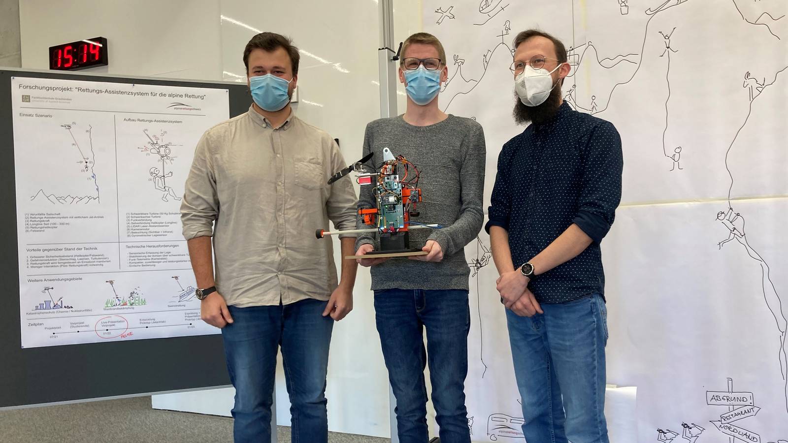 Im Januar 2022, am Schluss des Semesters, kam es schliesslich zum grossen Showdown: Die Studierenden durften an einem gemeinsamen Anlass mit dem Projektpartner, der Alpinen Rettung Schweiz (ARS), die von ihnen entwickelten Systeme präsentieren. Auf diese Weise konnten die Studierenden und das Forschungsprojekt wieder zusammengeführt werden. Die Erkenntnisse der Studierenden fliessen nun in das Forschungsprojekt ein, womit sie einen wichtigen Beitrag daran leisten konnten.