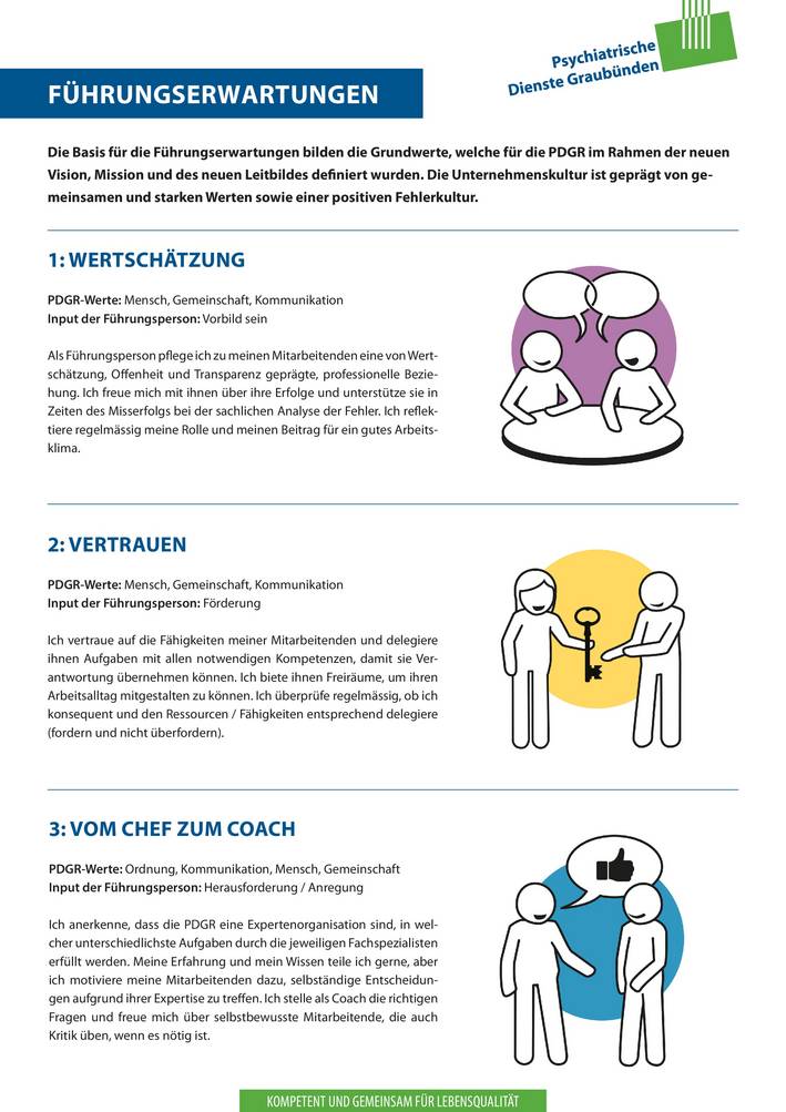 «Die wesentlichen Haupttreiber für unsere Entscheidung waren die neuen strategischen Ausrichtungen, der Paradigmenwechsel und die verschiedenen Generationen, die im Arbeitsleben aufeinandertreffen. Mir liegt besonders am Herzen», sagt Josef Müller, CEO der PDGR, «weiterhin die Vertrauenskultur innerhalb der PDGR zu stärken und wichtige Werte – wie Wertschätzung und Anerkennung – noch mehr zu festigen. Diese Aspekte sind auch in der Vision und in den Führungserwartungen der PDGR verankert.»