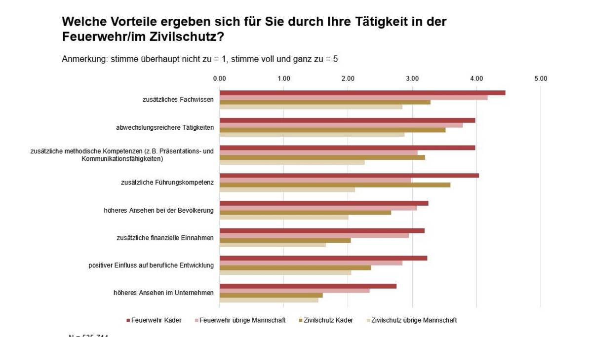 Um das Engagement attraktiver zu gestalten und damit die Bereitschaft zum Kaderdienst zu erhöhen, wurden von den Befragten einige Massnahmen besonders befürwortet: Den Ausbau von finanziellen Anreizen betrachten Angehörige der Feuerwehr und des Zivilschutzes als eines der wirkungsvollsten Mittel zur Förderung der Attraktivität des Milizdienstes. Hier besteht gerade im Zivilschutz offenbar Nachholbedarf. Weiterbildungsgutscheine und vor allem die Anrechnung des geleisteten Dienstes an Weiterbildungen (z. B. in Form von ECTS-Punkten bei Programmen der Universitäten und Fachhochschulen) stossen bei den Befragten durchaus auf Sympathie. Weiter stehen die Angehörigen des Zivilschutzes dem stärkeren Einbezug von Frauen und – in abgeschwächter Form – von niedergelassenen Ausländerinnen und Ausländern positiv gegenüber. Um den Feuerwehr- und Zivilschutz für die Zukunft zu sichern, ist konkret zu prüfen, wie Frauen besser angeworben werden können und wie der Dienst für niedergelassene Ausländerinnen und Ausländer geöffnet respektive bekannter gemacht werden kann. Weiter zeigt sich, dass die Arbeitgebenden ihre Mitarbeitenden tendenziell zu wenig ermuntern, ein (weiteres) Engagement in der Feuerwehr und im Zivilschutz anzunehmen. Ein Austausch mit der lokalen und regionalen Wirtschaft könnte dazu beitragen, dass Arbeitgebende die Wichtigkeit der beiden Dienste besser verstehen und den Wert der durch sie erworbenen Kompetenzen noch mehr zu schätzen wissen. Gerade für regionale Arbeitgebende kann dieser Wissensaustausch einen wichtigen Beitrag zur Regionalentwicklung leisten. So bleibt das freiwillige Engagement in Feuerwehr und Zivilschutz auch in Zukunft zeitgemäss.