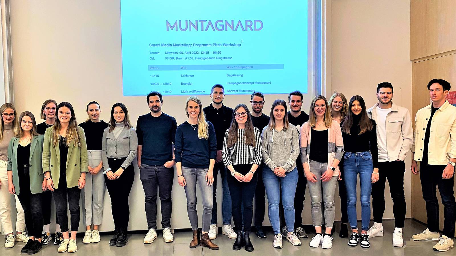 Im Agentur-Briefing verspricht sich «Muntagnard» von den Agenturteams der FHGR-Betriebsökonomie-Studierenden eine schlagkräftige Kampagne für die neue Golfmode-Kollektion im Premium-Segment, die mit knappen verfügbaren Ressourcen zu realisieren ist. Im anschliessenden Unterricht durchlaufen die Teams den systematischen Prozess der Kampagnenplanung mit den drei Hauptphasen «strategische Analyse», «Kreation» und «Realisierung». Situativ sind dabei auch stets Gastdozierende aus der Marketingpraxis im Einsatz. So macht etwa der Churer Werbeprofi Kajo Bächle (BELLEVUE7K) die Agenturwelt begreif- und erlebbar. Die Praxis der kommunikativen Kreativitätstechniken in einer Werbeagentur erlernen die Studierenden «first hand» vom vielfach international ausgezeichneten Creative Director Sören S. Schröder (Geschäftsleitung Publicis Zürich).