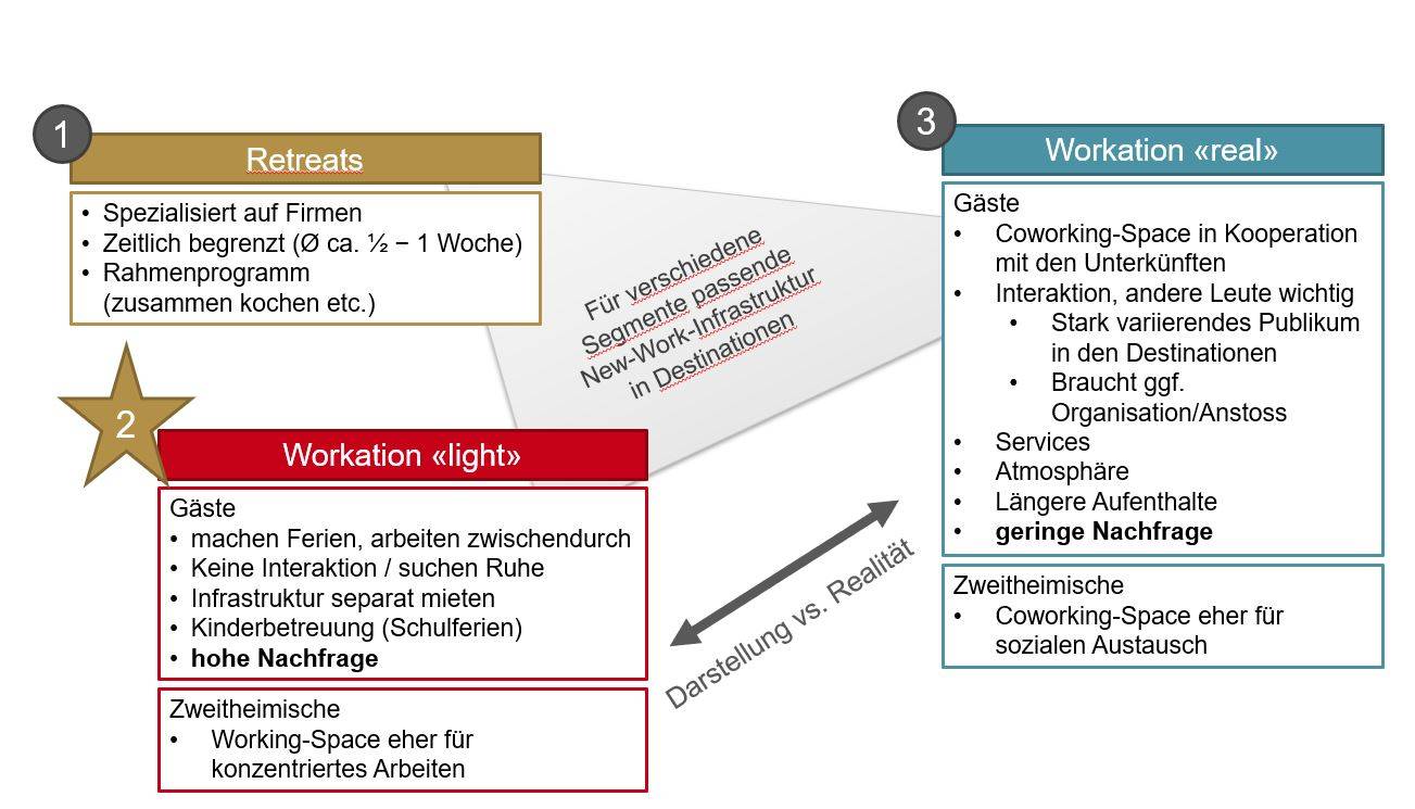 Neue New-Work-Infrastrukturen – bspw. (Co-)Working-Spaces – sollten gleichzeitig unterschiedliche Segmente ansprechen, damit sie wirtschaftlich rentieren. Dabei muss die Bedürfnisdiversität berücksichtigt und bedient werden – gegebenenfalls über Kooperationen auf Destinationsebene. Zudem ist darauf zu achten, dass die Angebotskommunikation der Realität von Angebot und Nachfrage entspricht. Das kann herausfordernd sein, da viele Gäste zwar Workation-light-Angebote nachfragen, sich selbst jedoch aufgrund des sozialen «Prestiges» (z. B. indem sie Fotos aus ihren «Arbeitsferien» in den sozialen Medien posten) als Workation-real-Gäste («Digital Nomads») wahrnehmen.