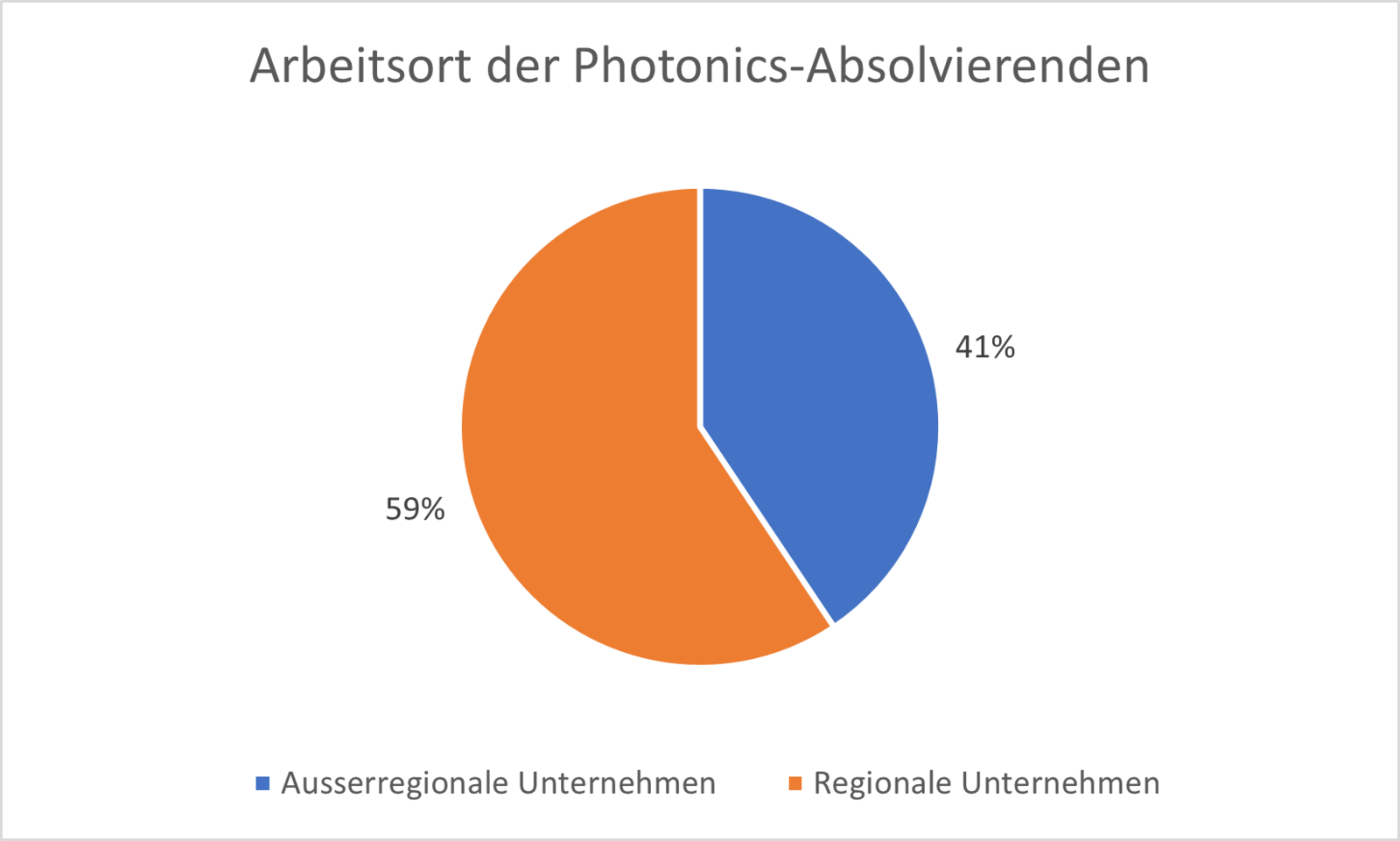 In einem weiteren Schritt wurden die Bachelorarbeiten untersucht. Die Themen für die Abschlussarbeiten müssen aus der Industrie kommen und einen Bezug zu Photonics haben. Die Partnerfirmen haben jeweils bis Ende November Zeit, ihre Aufgabenstellungen einzureichen. Die Studierenden wählen dann bis Anfang Januar ihr Wunschthema aus. Von den insgesamt 39 Bachelorarbeiten wurden 32 (82 Prozent) in Kooperation mit einem Partnerunternehmen durchgeführt. 22 Arbeiten (56 Prozent) wurden bei regionalen Unternehmen durchgeführt. Die Analyse zeigt, dass 39 Prozent (15 Personen) der Absolvierenden nach Abschluss der Bachelorarbeit direkt als Ingenieurin oder Ingenieur für die betreffende Firma tätig geworden sind. Die Zahl der eingereichten Aufgabenstellungen seitens der Partnerfirmen ist jeweils bedeutend grösser als die Zahl der Photonics-Studierenden. Deshalb sind die Unternehmen bestrebt, möglichst attraktive Bachelorthemen einzureichen. Der Kampf um die Fachkräfte beginnt also bereits vor dem Abschluss des Studiums und eine vielversprechende Arbeitswelt wartet auf weitere Photonics-Absolvierende.