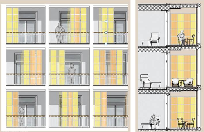 Neue Anwendungsmöglichkeiten von Photovoltaik eröffnen den Planern neue gestalterische Möglichkeiten, die es auch zu nutzen gilt. Eine Solaranlage muss heute nicht einfach eine schwarze Fläche sein. So plante die Studentin Nadja Schürmann eine Solarfassade am Hotel Waldhaus Davos aus beweglichen, verschiedenfarbigen Paravent-Elementen, die gleichzeitig Schatten spenden.