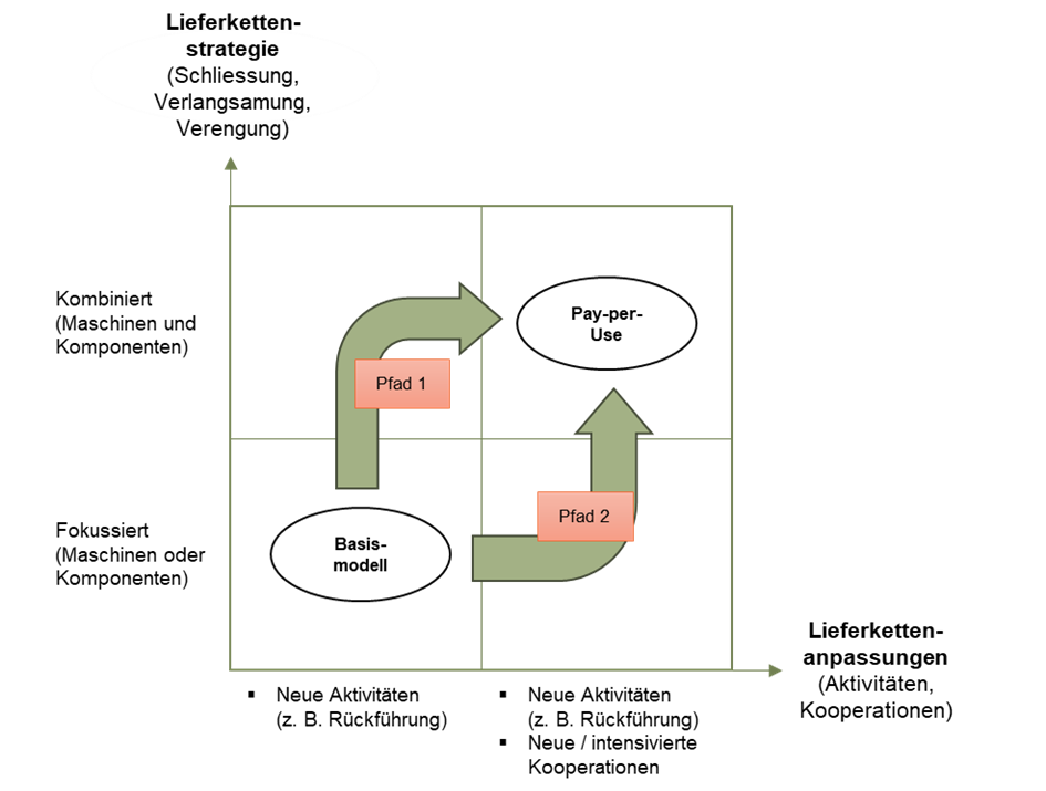 Die Ergebnisse zeigen, dass die Transformation zum angestrebten Zielzustand (Pay-per-Use-Modell) über zwei unterschiedliche Pfade erfolgen kann.