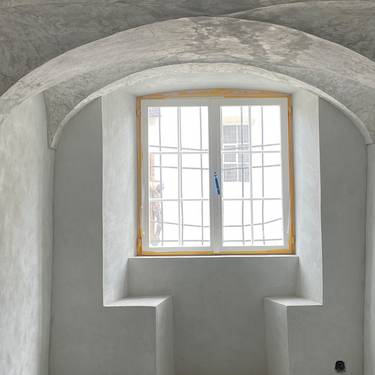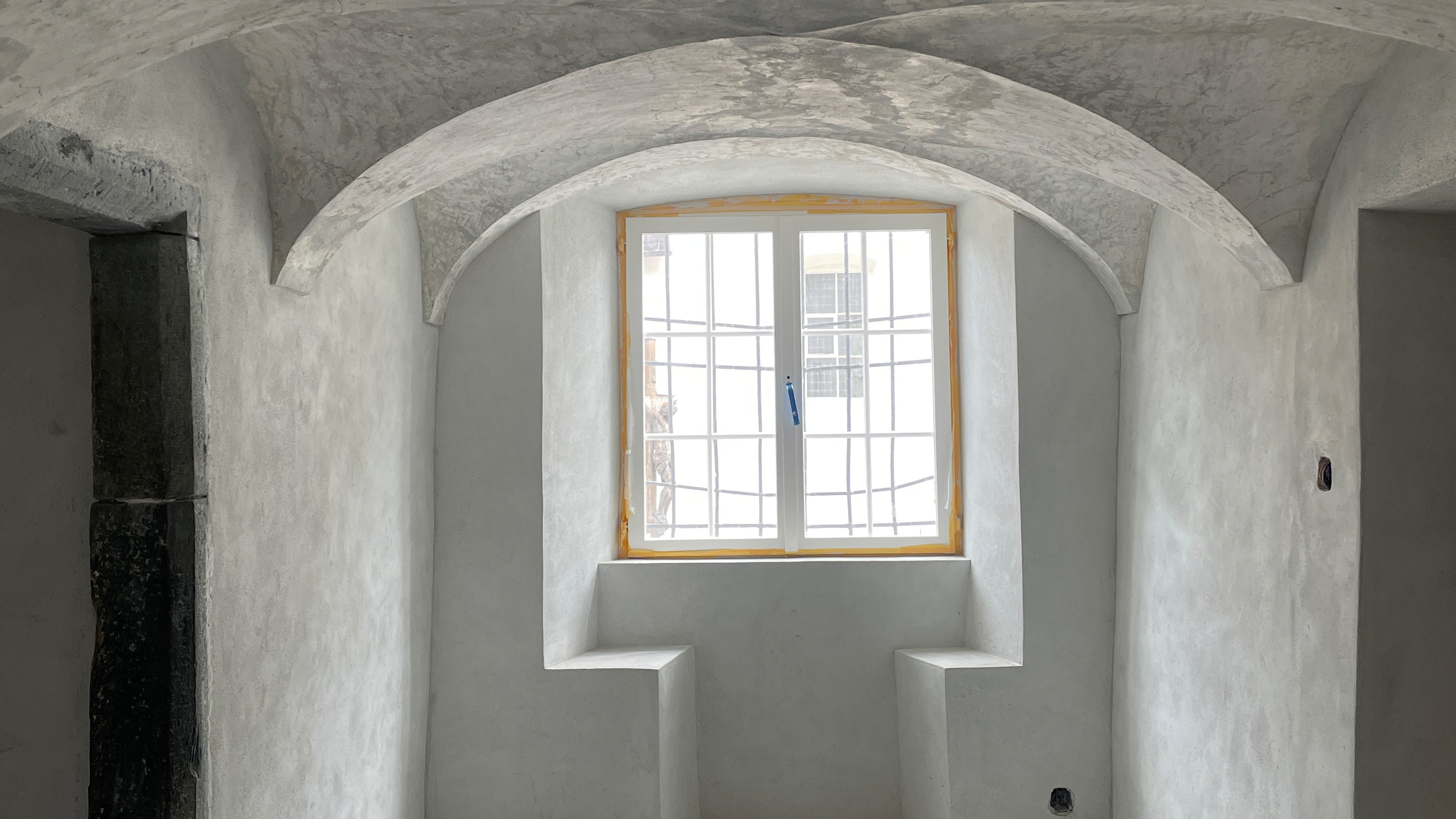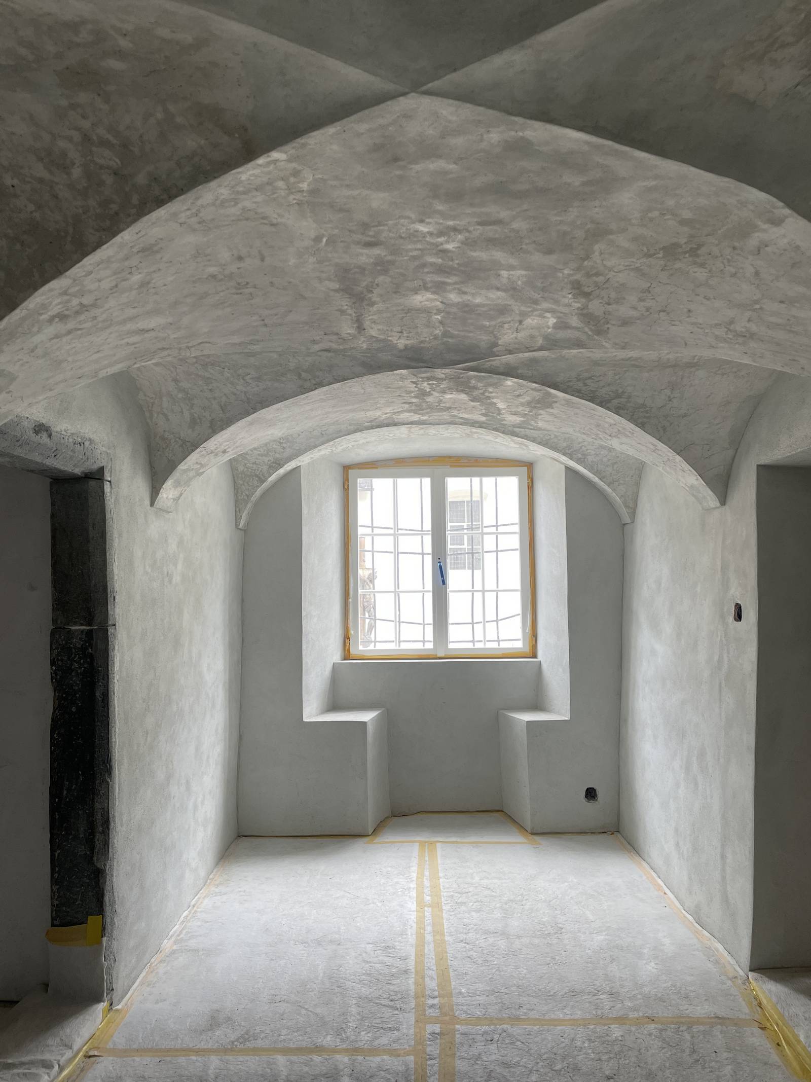 In Rueun steht das 1612 durch Landrichter Johann Simeon Deflorin und seine Frau Anna von Capol errichtete Obere Deflorinhaus. Als massiver Baukörper steht dieses Haus an prominenter Lage gegenüber der Pfarrkirche. Im Rahmen der 2022 begonnenen Renovation – durchgeführt vom Architekturbüro Nickisch Walder – musste dessen Kalksteinputz oftmals komplett neu aufgebaut werden. Hierzu galt es, zuerst die bestehenden Putzschichten zu entfernen und im nächsten Arbeitsschritt fehlerhafte Stellen auszubessern. Anhand der Gewölbehalle (siehe Abbildung) kann dieser Arbeitsschritt schön aufgezeigt werden. Im Gegenlicht ist das gefleckte Gewölbe zu sehen. Noch im Originalzustand erhaltene Stellen sind heller als die ausgebesserten Stellen, die eine leicht gräuliche Einfärbung zeigen. Da das ursprüngliche Gewölbe eingeknickt war, mussten nach strukturellen Sanierungsarbeiten an den freigelegten Gewölben sowohl Kanten als auch Gewölbeanschlüsse neu gezogen werden – mit viel Fachwissen ausgeführt von Baukunst Graubünden.