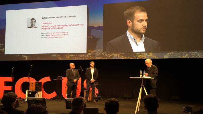 Im Januar 2016 wurde zum dritten Mal der Preis «Best of Bachelor» für Bachelor-Arbeiten aus dem Studienbereich Bauingenieurwesen vergeben. Als Vertreter der FH Graubünden wurde Lukas Bless für seine Arbeit «Neubau in einem Rutschgebiet – Baugrube und Fundation» im Liechtensteinischen Triesenberg ausgezeichnet. Er hatte sich mit der Baugrube und der Fundation des Pflegeheim-Neubaus in einem Rutschgebiet befasst. Dabei suchte er im Variantenstudium Baugrubenabschlüsse, welche die bis zu elf Meter tiefe Baugrube umschliessen und die nahegelegenen Denkmalschutzobjekte sichern konnten. Zudem wägte er ab, ob eine Flachfundation möglich oder eine Tiefenfundation notwendig sein würde. Ein Überwachungskonzept und eine Kostengrobschätzung rundeten seine Diplom-Arbeit ab. Prof. Dr. Imad Lifa, Leiter des Instituts für Bauen im alpinen Raum (IBAR) der FH Graubünden, freut sich über den Erfolg und betont: «Da die Jury von der jeweiligen Hochschule unabhängig ist, ist es auch ein objektiver Leistungsvergleich mit den anderen Schweizer Fachhochschulen.»