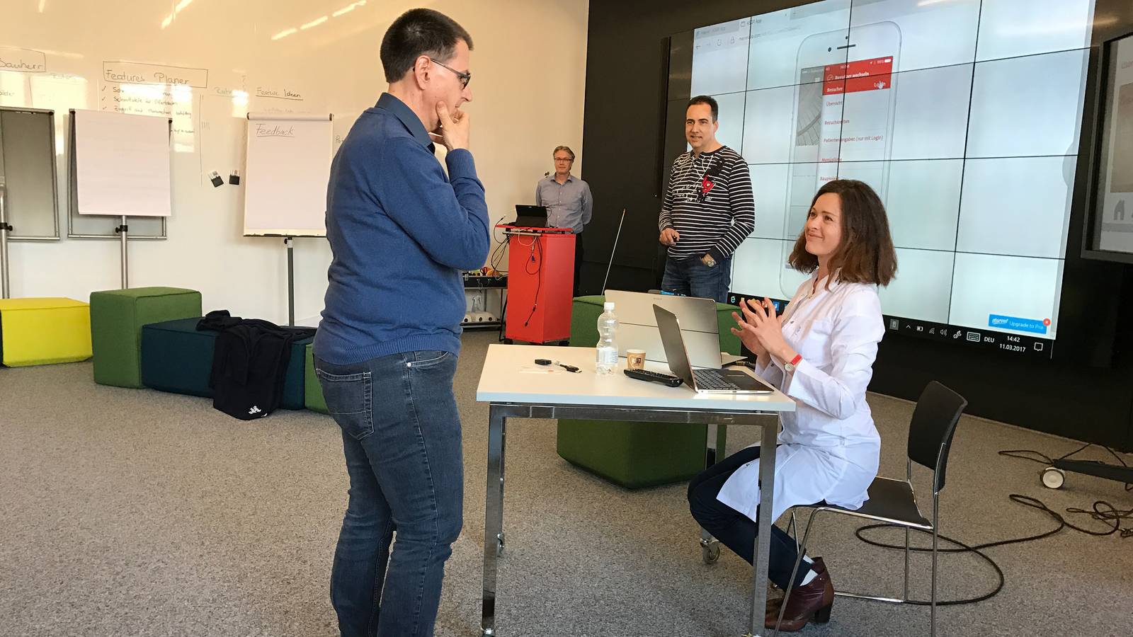 Am Samstag war dann der grosse Demonstrations-Tag. Die Gruppen hatten endlich Gelegenheit, ihre digitalen Prototypen den Kommilitoninnen und Kommilitonen zu präsentieren. Hierbei wurde insbesondere darauf geachtet, ob die Präsentation der digitalen Prototypen dazu geeignet war, die zu Beginn formulierte Innovation zu visualisieren, den Nutzen für die Zielgruppe aber auch für das betroffene Unternehmen aufzuzeigen und den Praxisbezug verständlich zu erläutern.