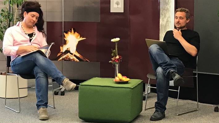 Anschliessend stand den Gruppen das Labor zur Verfügung. Die beiden Dozenten Philipp Bachmann (Leiter SIL) und Andreas Ziltener standen den Studierenden dabei als Coaches, Leih-Schauspieler, Methoden-Experten, aber auch als Kritiker zur Seite. Die Studierenden konnten, angeleitet und unterstützt mit Methodenwissen, ihre digitalen Prototypen bauen, überarbeiten, testen und weiterentwickeln.